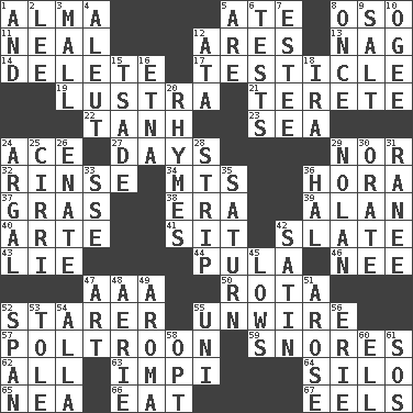 ACROSS 1. _ mater 5. Had dinner 8. Bear (Spanish) 11. Anneal 12. Ancient Greek god of war 13. Tired old horse 14. Keyboard key 17. One of the two male reproductive glands 19. A period of five years 21. Cylindrical with tapered ends 22. Hyperbolic tangent 23. Ocean 24. Adept person 27. 24-hour periods 29. And not 32. Wash lightly 34. Mountains (abbr.) 36. Israeli folk dance 37. Pate de foie ____ 38. Epoch 39. Actor Alda or Thicke 40. Johnson of "Laugh-In" 41. Be seated 42. Schedule 43. Untruth 44. Monetary unit of Botswana 46. Born 47. American Automobile Association (abbr.) 50. Round or rotation of duties 52. A viewer who gazes fixedly 55. Undo the wiring of 57. Coward 59. Sounds asleep 62. Everything 63. Body of Kaffir warriors 64. Grain storage tower 65. Teachers' org. 66. Consume 67. Snakelike fish DOWN 1. Added to 2. Area sheltered from the wind 3. Promenade 4. Eskimo relative 5. "We ___ not amused" (Victoria) 6. Trials 7. First name in cosmetics 8. Single time 9. Table seasoning 10. Double curve, resembling the letter S 12. _ moment's notice (2 wds.) 15. Sadhe (variant) 16. Inactive volcano in Sicily 18. Retirement account (abbr.) 20. Poems 24. Therefore, facetiously 25. High-altitude cloud 26. Related on the mother's side 28. Remove all contents or possession from 29. Pitcher Ryan 30. Declaim 31. The wife of a rajah (variant) 33. Compass dir. 35. Titan orbits this 36. Actor Linden 42. Smooth fabric 45. Moos 47. Tate display 48. Nest on high 49. Odor 51. Came up 52. Connect, as a bridge 53. Lacquered or enameled metalware 54. Silent film actress Nazimova 55. Corn or form start 56. 4th largest of the Great Lakes 58. Choose 60. Pipe bend 61. Distress signal