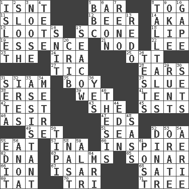 ACROSS 1. Is not 5. Oblong piece of solid material 8. Coat; cloak 11. A type of plum 12. Fermented drink made from hops 14. Alias (abbr.) 15. Plunders 17. Biscuitlike quick bread 18. Mouth edge 19. Gist 21. Allow head to fall sleepily 22. Area sheltered from the wind 23. Definite Article 24. Retirement account (abbr.) 25. Baseball player Mel 27. Nervous spasm 28. Hearing organs 31. Thailand, formerly 35. Male child 37. Turn sharply 38. Celtic language 39. Soggy 41. Portable shelter 42. Trial 43. A female animal or person 45. Fast planes 46. SW Saudi Arabia district 47. Begley and Asner 49. Arrange properly for use 51. Ocean 52. ___ good deed 55. Erode 57. _ tizzy (2 wds.) 60. Heighten or intensify 62. Heredity factor (abbr.) 63. Insides of hands 65. Underwater navigation system 66. Electrically charged atom 67. Austrian river, tributary to the Danube 68. Suttee (variant) 69. Make lace 70. Three (prefix) 71. Relationship diagram DOWN 1. Small island 2. Splash clumsily 3. Trap for birds or small mammals 4. False hair 5. English channel? 6. A really long time 7. Western Nevada city 8. Baron Munchausen's specialties 9. Migrant worker of the '30s 10. Open wide 13. Redecorate 16. In a ____ (agitated or irritated) 17. Manatee 20. Baby bed with high sides 26. Trials 29. Undersized animal 30. Arranges properly for use 31. Stalk of a moss capsule 32. Angers 33. Aide 34. Distance measurement (Brit.) 36. Affirmative reply 40. College paper 44. Paradise 48. Backtalk 50. Native american tent (variation) 52. Middle Eastern gold or silver currency 53. Speak pompously 54. Nest on high 55. Prepare for publication 56. Small Philippine buffalo 58. Political cartoonist Thomas 59. Having or resembling wings 61. Mail 64. Medical imaging device (abbr.)