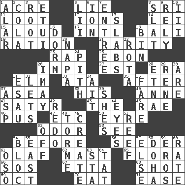 ACROSS 1. Measure of real estate 5. Whopper 8. _ Lanka 11. Spoils 12. Charged atoms 14. Flowery wreath 15. Verbally 17. International (abbr.) 18. Indonesian resort city 19. Food allowance for one day 21. Noteworthy scarcity 23. Reproach for some lapse or misdeed 25. Inky black, to poets 26. Body of Kaffir warriors 27. Eastern Standard Time (abbr.) 28. Epoch 31. Shade tree 33. "One Day ___ Time" 35. Following 37. At sea 38. Part of HMS, perhaps 40. Singer Murray 41. Letch 43. Definite Article 45. Actress Charlotte 46. Festering 47. And so on (abbr.) 50. Jane of fiction 52. Scent 53. Perceive with the eye 54. Prior to 56. Sowing specialist 61. Norwegian king 62. Vertical spar for supporting sails 65. Plants 66. Distress signal 67. Singer James 68. Opportunity 69. Sep. follower 70. Erode 71. Relaxation DOWN 1. Having or resembling wings 2. Root beer relative 3. Carrot, for example 4. Needle holder 5. Cards in a Roman deck? 6. Electrically charged atom 7. Main course 8. Narrow board 9. Trust 10. One more than two 13. Thick slices 16. Dormintory (informal) 18. Storage container 20. California wine valley 22. Roll call or roster of names 24. Essential or central part 26. "If ____ say so..." 28. Inactive volcano in Sicily 29. French philosopher Descartes 30. "We ___ not amused" (Victoria) 31. He sold his birthright 32. Allows 34. Small island 36. Conductor's collection 37. Cleo's killer 39. "______ My Girl" (Turtles hit) 42. Make new 44. Snake ____ (dice throw) 48. Singer Mel 49. Cause to be 51. Coral collection 52. Below a satisfactory level 54. Coalition 55. 90 degrees 57. Otherwise 58. Capital of the state of Qatar 59. Greek god of love 60. Pace 61. Bear (Spanish) 63. R.R. building 64. Make lace