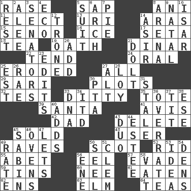 ACROSS 1. Raze (variant) 5. Plant excrement 8. Black tropical American cuckoo 11. Voters do this 13. RI univ. 14. Caspian sea tributary 15. Sir (Sp.) 16. Frozen water 17. Bristle 18. Beverage made from leaves 19. Pledge 21. Middle Eastern gold or silver currency 22. Look after 24. Taken by mouth 25. Worn away 27. Everything 29. Indian skirt 30. Ground plans 32. Trial 33. Simple song 35. Carryall 39. Before Barbara or Clara 41. Deliberation 42. Male parent 43. Keyboard key 45. Disposed of to a purchaser 48. One who uses or employs something 49. All-night dance parties 50. Native of Scotland 52. To free from 55. Collude with 56. Snakelike fish 57. Elude 59. Airtight sealed metal containers 60. Born 61. Ingested 62. Followers of ems 63. Shade tree 64. Afternoon social gatherings DOWN 1. State of inaction 2. Toward shelter 3. Elected representatives 4. Environmental prefix 5. Set of matching outer garments 6. Bowlike part 7. Sliced dessert 8. Sports stadium 9. Brizilian seaport 10. Austrian river, tributary to the Danube 12. Marketplace scale 14. SW Saudi Arabia district 20. Find the sum of 21. Stupid person 23. Proofreads 25. Eastern Standard Time (abbr.) 26. Actress Charlotte 27. The first octave above the treble staff 28. Myrna of the movies 30. Parent Teacher Assoc. 31. Having lost freshness 33. Heredity factor (abbr.) 34. It would 36. Make much ado about nothing 37. Teat (slang) 38. Compass dir. 40. Does sums 43. Superhero pair 44. First name in cosmetics 45. Unit of acoustic absorption 46. Baking chambers 47. Allows 49. Pace 50. Sew up the eyelids of hawks and falcons 51. Clement's nick name 53. The main thing one is thinking about 54. Cub Scout units 56. Compass dir. 58. Large container