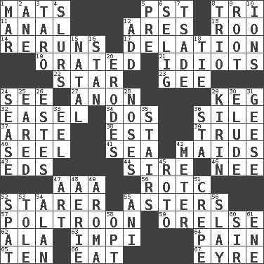 ACROSS 1. Floor protectors 5. Pacific Standard Time (abbr.) 8. Three (prefix) 11. Of or related to the anus 12. Ancient Greek god of war 13. Friend of Pooh 14. Summer TV shows 17. Accusation by an informer 19. Spoke pompously 21. Foolish or stupid persons 22. Play the lead 23. Turn to the right 24. Observe 27. Soon (poet.) 29. Cask 32. Artist's stand 34. Two (Sp.) 36. Filth; sediment 37. Johnson of "Laugh-In" 38. Eastern Standard Time (abbr.) 39. Loyal 40. Stitch closed the eyes of (a falcon) 41. Ocean 42. Women servants 43. Begley and Asner 44. Father 46. Born 47. Auto club (abbr.) 50. College mil. group 52. A viewer who gazes fixedly 55. Michaelmas daisies 57. Coward 59. Threatening words 62. In the manner of 63. Body of Kaffir warriors 64. Ache 65. "___ Little Indians" 66. Erode 67. Jane of fiction DOWN 1. Spoil 2. One (Scot) 3. Pacific island yam 4. Plays smoothly or legato 5. Before (prefix) 6. Former Milwaukee Brewers owner Bud 7. Sadhe (variant) 8. Musical group of three 9. Carrot, for example 10. Charged particles 12. Say or write further 15. Relating to or accompanying birth 16. Comedian Laurel of Laurel & Hardy 18. Make a knot 20. Eats (away) 24. Gospel singer Marvin 25. Having ears or earlike features 26. _____ Park, CO 28. Olfactory organs 29. Japanese brewing company 30. Dodge 31. Honkers 33. Snakelike fish 35. Flight of steps 36. R.R. building 42. Distance measurement 45. Printing process, for short 47. Nonscientific branch of learning 48. Nest on high 49. Odor 51. Streamer paper 52. Petty quarrel 53. Lacquered or enameled metalware 54. ____ Jay Lerner 55. Cuckoo 56. Kill 58. Choose 60. Title for a knight 61. Compass dir.
