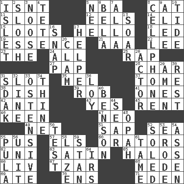 ACROSS 1. Is not 5. Basketball assoc. 8. Domesticated feline 11. A type of plum 12. Snakelike fish 14. Connecticut Ivy Leaguer 15. Plunders 17. Phone greeting 18. Directed 19. Core 21. Auto club (abbr.) 22. Area sheltered from the wind 23. Definite Article 24. Everything 25. Strike 27. Infant food 28. Burn to charcoal 31. Slit 35. Cartoonist voice _ Blanc 37. Heavy book 38. Food container 39. Director Reiner 41. Washington bills 42. Opposed to 43. It is so 45. Monthly bill 46. Peachy ____! 47. Modern: prefix 49. Remaining after all deductions 51. Plant excrement 52. Ocean 55. Suppuration 57. Raised railways 60. Speakers 62. University (slang) 63. Smooth fabric 65. Rings 66. 54 in ancient Rome 67. Russian ruler 68. Ancient Persian 69. Had dinner 70. Followers of ems 71. Paradise DOWN 1. Small island 2. Splash clumsily 3. Trap for birds or small mammals 4. Wig 5. Born 6. Actor Lugosi 7. Silent film actress Nazimova 8. Portable communications device 9. Toward shelter 10. Event that recurs at intervals 13. Fly high 16. Fastener 17. Assistant 20. Dollar (slang) 26. Thespian 29. So be it 30. Remainder 31. Neighbor of Neb. 32. Actor's bit 33. Clearly or manifestly demonstrative 34. One or ones belonging to thee 36. Myrna of the movies 40. Gillaume's butler role 44. Scorch 48. Brightly colored fish 50. Trial 52. Having a sole or soles 53. Eat (away) 54. NE Netherlands city 55. Monetary unit of Botswana 56. A single undivided whole 58. Goldbrick 59. Comedian Laurel of Laurel & Hardy 61. Not wild 64. Big collection agency