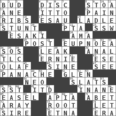 ACROSS 1. Partially opened flower 4. Flat circle 8. Portico 12. One (Scot) 13. "Tell ____ the Marines!" 14. Ache 15. Teases 17. He sold his birthright 18. Dipping utensil 19. Check the growth or development of 21. Parent Teacher Assoc. 23. Compass dir. 24. 1973 Nobel Price Winner (Physics) Leo 26. Housemaid (var.) 28. Mail 30. Normal relaxed breathing 34. Distress signal 37. Path through which fluid escapes 39. Of or related to the anus 40. Affectionate concern, for short 41. Bert's buddy 43. Compass dir. 44. Norwegian king 46. Trig term 47. Perceive with the eye 48. Flamboyance 51. Small, secluded valley 54. Modern: prefix 55. Narrow boards 58. Fast jet (abbr.) 61. It would 63. Silly 65. Artist's stand 67. Capital of Western Samoa 71. Collude with 72. Like ___ of sunshine 73. Carrot, for example 74. Allow 75. The founder of a family 76. Inactive volcano in Sicily 77. Epoch DOWN 1. Taverns 2. Join together 3. Alight from a bus 4. Pass on 5. ___ a Wonderful Life 6. R.R. building 7. Overturn; upset 8. Health resort 9. Bits 10. Lubricates 11. Afresh 16. Fastener 18. Desk light 20. Ring climax 22. The 19th letter of the Greek alphabet 25. Capri or Wight 27. Santa ___, CA 29. Laconic 30. Supplementing with great effort 31. Singles 32. Comfort 33. Toward shelter 34. Cease 35. Water jar 36. Glance over 38. Black tropical American cuckoo 42. Snakelike fish 45. Avid follower 49. To provide with a ceiling 50. Being at a high temperature 52. Connecticut Ivy Leaguer 53. Nanny 56. Eating place 57. Scornful expression 58. Oceans 59. Indian skirt 60. Russian ruler of old 62. Have the gumption 64. Singer James 66. Sight organ 68. Plant holder 69. Electrically charged atom 70. "One Day ___ Time"