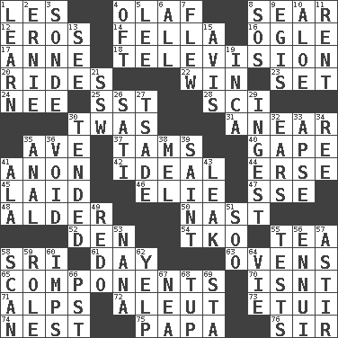 ACROSS 1. French article 4. Norwegian king 8. Shrivel 12. Greek god of love 14. Man or boy (slang) 16. Stare at amorously 17. Queen of England 1702-14 18. Household entertainment appliance 20. Amusement-park features 22. Victory 23. Put into a specified state 24. Born 25. Fast jet (abbr.) 28. _-fi 30. It was, poetically 31. Approach 35. "___ Maria" 37. Scottish caps 40. Yawn 41. Soon (poet.) 42. Perfect 44. Celtic language 45. Put down 46. Writer Wiesel 47. Compass dir. 48. Tree or shrub in the Birch family 50. Political cartoonist Thomas 52. Lair 54. Ring climax 55. Beverage made from leaves 58. Indian title of respect (Mr.) 61. 24 hours 63. Baking chambers 65. Parts 70. Is not 71. High mountains 72. Native American of Southwest Alaska 73. Needle holder 74. A home for chicks 75. Dad 76. Title for a knight DOWN 1. Memorize 2. Bert's buddy 3. Message 4. Often (poetically) 5. Area sheltered from the wind 6. 100% 7. Soared 8. Distress signal 9. Armor plate that protects the chest 10. Medicinal plant 11. Monthly bill 13. Observe 15. Opinion 19. South American Indian 21. Compass dir. 26. Suttee (variant) 27. Sadhe (variant) 29. Eat 30. Looked after 32. Hearing organs 33. Domed church section 34. Portuguese money of account (variant) 35. Of or related to the anus 36. Lacking any legal or binding force 38. Cartoonist voice _ Blanc 39. Inhabitant of Heaven 41. According to 43. Path through which fluid escapes 49. Do over again 51. "Barney Miller" actor Jack 53. Nanny 55. Trials 56. World-weariness 57. Moving about 58. Examine hastily 59. Hero or heavy, e.g. 60. Naughty children 62. Sharp bark 64. Compete 66. Pacific Standard Time (abbr.) 67. Teachers' org. 68. Uncastrated adult male sheep 69. R.R. building