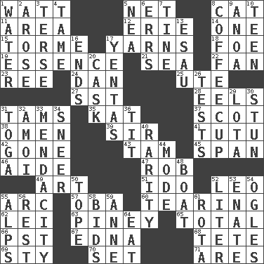 ACROSS 1. Electrical Unit 5. Remaining after all deductions 8. Domesticated feline 11. Type of rug 12. 4th largest of the Great Lakes 14. Single 15. Singer Mel 17. Entertaining tales 18. Enemy 19. Center 21. Ocean 22. Avid follower 23. To riddle 24. Daniel's nick name 25. Shoshoni 27. Fast jet (abbr.) 28. Snakelike fish 31. Scottish caps 35. Krazy ___ of comics 37. Highlander 38. Sign of things to come 39. Title for a knight 41. Ballerina skirt 42. Went 43. Scottish cap 45. Connect, as a bridge 46. Helper 47. Director Reiner 49. Nonscientific branch of learning 51. Wedding promise 52. Lion 55. Curve 57. Chief or king in Benin or Nigeria 60. Separating forcefully 62. Luau accessory 63. Abounding in pines 65. Add up to 66. Pacific Standard Time (abbr.) 67. Pulitzer Prize-winning author Ferber 68. False hair 69. Filthy place 70. Put into a specified state 71. Ancient Greek god of war DOWN 1. Wetness 2. Came up 3. Laconic 4. Docile 5. Teachers' org. 6. Blunders 7. Prong on a fork 8. Java holder (2 wds.) 9. Small Philippine buffalo 10. Adolescent 13. He sold his birthright 16. Conclusions 17. Gossips 20. Keg 26. Trials 29. Globular water bottle used in Asia 30. Astound 31. Ancient Roman robe 32. Mine, in Marseilles 33. Ananias' fault 34. Scornful expression 36. Teat (slang) 40. Noteworthy scarcity 44. Method 48. Water vessel 50. Drink excessively 52. 61 cubic inches 53. Related on the mother's side 54. Stares 55. High mountains 56. Respite 58. Auction offers 59. Singer Murray 61. Round or rotation of duties 64. Consume