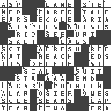 ACROSS 1. Viper 4. Unable to walk 8. Proofreading order 12. Modern: prefix 13. Having ears or earlike features 14. Story 15. Hearing organs 17. Learning spot: Fr. 18. Operatic vocal solo 19. Paper fasteners 21. Annoying sounds 23. _ de Janeiro 24. Perceive with the eye 26. RI univ. 27. Table seasoning 28. Straggles 30. _-fi 31. Anew 34. To sift 37. Krazy ___ of comics 38. Arrive at 39. Begley and Asner 40. It is 41. Keyboard key 42. Be seated 43. Lick closed 44. Set or collection 46. R.R. building 47. Auto club (abbr.) 50. Conclude 51. Fortification 54. Hard copy producer 57. Having or resembling wings 58. Flexible twig of a willow tree 60. Washington bills 62. Flatfish 63. Seines 64. Head covering 65. Pull apart 66. Inactive volcano in Sicily 67. Period DOWN 1. A saturated hydrocarbon 2. Oceans 3. Likenesses of persons 4. Shoestrings 5. Came up 6. Cartoonist voice _ Blanc 7. Locale of original sin 8. Flight of steps 9. Tarsus (plural) 10. Writer Wiesel 11. Beverages made from leaves 13. Snakelike fish 16. Travel by water 20. Cooking vessel 22. Ending for "Through" and "Enough" 25. Choose 27. Scram, to a cat 29. American tennis player Robert 30. What Jean-Claude Killy likes to do 31. Length times width 32. Man or boy (slang) 33. Actress Charlotte 34. Dwelling 35. Prepare for publication 36. Eastern Standard Time (abbr.) 41. Letter starter 43. A viewer who gazes fixedly 44. Elected rep. 45. To (old English) 46. Any of the three canals of the cochlea 48. Bee-related 49. Sports stadium 51. 90 degrees 52. _ gin 53. Airs 55. Big collection agency 56. Located in or toward the back 59. Put into a specified state 61. Health resort