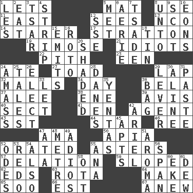 ACROSS 1. Allows 5. Floor covering 8. Purpose 11. 90 degrees 12. Observes 13. Non-commissioned officer (abbr.) 14. A viewer who gazes fixedly 17. Ski resort town in Vermont 19. Full of chinks, cracks, or crevices 21. Foolish or stupid persons 22. Essential or central part 23. Car or cant ending 24. Had dinner 27. Frog relative 29. Infant locale 32. Shopping centers 34. 24 hours 36. Actor Lugosi 37. Toward shelter 38. Compass dir. 39. Opinion 40. Religious group 41. Lair 42. Representative 43. Fast jet (abbr.) 44. Play the lead 46. To separate or throw off 47. Nanny (var.) 50. Capital of Western Samoa 52. Declaimed 55. Michaelmas daisies 57. Conveyance 59. Inclined 62. Begley and Asner 63. Round or rotation of duties 64. Create 65. "Barney Miller" actor Jack 66. Eastern Standard Time (abbr.) 67. Afresh DOWN 1. French article 2. Ingest 3. Russian ruler of old 4. Empty completely 5. Was introduced to 6. Nest on high 7. Sadhe (variant) 8. To (old English) 9. Highlander 10. Immeasurably long periods of time 12. Compass dir. 15. Gives off 16. Printing process, for short 18. Metal container 20. Cast a shadow over 24. Collect or gather 25. Lies 26. Voters do this 28. Natives or inhabitants of Denmark 29. Crowbar 30. Place in a line 31. Thick mixture 33. Allow 35. Gossips 36. Paper or plastic container 42. Satellite of Uranus 45. Flats, for short 47. _ moment's notice (2 wds.) 48. Distance measurement (Brit.) 49. Goodbye (Sp.) 51. Scent 52. Lyric poems 53. Do over again 54. In addition 55. Santa ___, CA 56. Connect, as a bridge 58. Baseball player Mel 60. Supplement with great effort 61. Morning condensation
