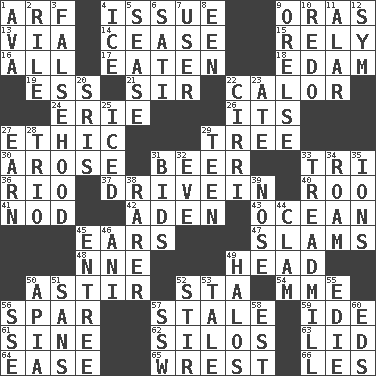 ACROSS 1. Sandy's bark 4. Come out of 9. Mouths or openings 13. By way of 14. Desist 15. Have trust in 16. Everything 17. Ingested 18. Dutch treat 19. Double-curved letter 21. Title for a knight 22. Bodily heat indicating an inflammation 24. One of the Great Lakes 26. It is 27. Moral principle 29. Relationship diagram 30. Came up 31. Fermented drink made from hops 33. Three (prefix) 36. River (Sp.) 37. Popular '50s hangout 40. Friend of Pooh 41. Lower and raise head in agreement 42. Arabian gulf 43. Sea 45. Hearing organs 47. Shuts with force 48. Compass dir. 49. Froth on beer 50. Being in motion 52. R.R. building 54. Madame (abbr.) 56. Practice fight 57. Having lost freshness 59. Binary compound 61. Trig term 62. Grain storage towers 63. Flaplike covering 64. Relaxation 65. Obtain by seizing forcibly or violently 66. French article DOWN 1. Actress Gardner 2. Cause heat under the collar 3. It jiggles the polygraph 4. Frozen water 5. Gospel singer Marvin 6. Suttee (variant) 7. One who makes use of a thing 8. Car or cant ending 9. Threatening words 10. Make new 11. Having or resembling wings 12. Symbol (abbr.) 20. Indian titles of respect 22. High-altitude cloud 23. Had dinner 25. On the rocks 27. Merit 28. Musical group of three 29. Adolescent 31. Auction offers 32. First lady 33. Excercise machine 34. Wander aimlessly 35. Charged atoms 38. More uncommon 39. Sense of smell 44. Burrowing marine mollusk 45. Main course 46. Black tropical American cuckoo 49. Rings 50. Capital of Western Samoa 51. Without 52. Move through with a circular motion 53. Falsehood 55. Singer Brickell 56. Compass dir. 57. Compass dir. 58. Eastern Standard Time (abbr.) 60. Begley and Asner