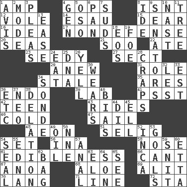 ACROSS 1. Electrical Unit 4. Republicans 8. Is not 12. Grand slam 14. Son of Isaac 15. Letter starter 16. The main thing one is thinking about 17. Unrelated to defense, as in spending 20. Oceans 21. "Barney Miller" actor Jack 22. Had dinner 23. Morally degraded 27. Religious group 29. Afresh 31. Hero or heavy, e.g. 34. Showing deterioration from age 35. Ancient Greek god of war 36. Inside; within (prefix) 39. Experiment locale 41. Inconspicuous attention getter 42. Adolescent 43. Amusement-park features 46. Chilled 47. Move on water 48. Period of immesurable duration 51. Former Milwaukee Brewers owner Bud 54. Arrange properly for use 56. _ tizzy (2 wds.) 58. Characteristic smell of wine 61. The property of being fit to eat 66. Patter 67. Small Philippine buffalo 68. _ vera 69. Set down 70. Long (Scottish) 71. Actor's bit 72. R.R. building DOWN 1. Advice 2. Method 3. Entreaties 4. Commissioned military rank (abbr.) 5. Bear (Spanish) 6. Baking dish 7. Soap bubbles 8. Binary compound 9. Elected representatives 10. Political cartoonist Thomas 11. Family _ (genealogy) 13. Comfort 18. Greek goddess of the dawn 19. Enemy 24. Erode 25. Heredity factor (abbr.) 26. Shout 28. Dice game 30. Puts on (as clothing) 32. French article 33. Eastern Standard Time (abbr.) 34. Something which is sent 36. And so on (abbr.) 37. Modern: prefix 38. Conveyance 40. Prejudice 44. Pass on 45. Pipe bend 49. Petroleum 50. Compass dir. 52. South American Indian 53. Finish lines 54. Lick closed 55. Pulitzer Prize-winning author Ferber 57. Of or related to the anus 59. In a ____ (agitated or irritated) 60. Singer James 62. Container for groceries 63. Connecticut Ivy Leaguer 64. Manchild 65. Perceive with the eye