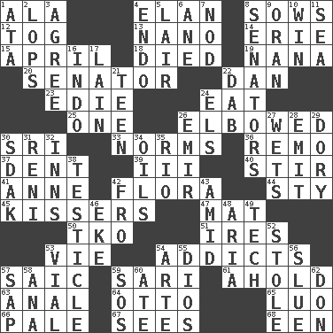 ACROSS 1. Chicken ___ king 4. Enthusiasm 8. Sty mamas 12. Coat; cloak 13. Billionth: prefix 14. 4th largest of the Great Lakes 15. Showery time 18. Passed on 19. Nanny 20. Elected representative 22. One of the 12 tribes of Israel 23. Singer Brickell 24. Consume 25. Single 26. Turned at an angle; bent 30. Indian title of respect (Mr.) 33. Typical models 36. San ____ (Riviera town) 37. Gouge 39. One more than two 40. Commotion 41. Singer Murray 42. Plants 44. Filthy place 45. Smoochers 47. Floor protector 50. Ring climax 51. Angers 53. Compete 54. Inveterate users 57. Ketch in the Levant 59. Indian skirt 61. Hold, grip (Informal) 63. Of or related to the anus 64. "Beetle Bailey" pooch 65. Nilotic language 66. Diluted with white 67. Perceives with the eye 68. Car or cant ending DOWN 1. _ moment's notice (2 wds.) 2. Chops off 3. Match 4. Inside; within (prefix) 5. Den 6. One (Scot) 7. Lower and raise head in agreement 8. Legislators 9. NW Algerian seaport 10. Victory 11. Ocean 16. _ china 17. (Had) reclined 21. Adolescent 22. Small moist lump or mass 24. Raised railways 26. Independent ruler or chieftain 27. Moistens 28. Give off 29. Dinghy 30. Neighbor of Neb. 31. Painter Guido (1575-1642) 32. Lodging establishments 34. Lubricates 35. _ de Janeiro 38. One of the two male reproductive glands 42. From 43. Among 46. Make supply last 48. Roberta Peters solo 49. Technology 52. Took without asking 53. Small bottle 54. Johnson of "Laugh-In" 55. "Vaya con ____" 56. Change direction abruptly 57. Plant excrement 58. Santa ___, CA 59. Distress signal 60. Had dinner 62. Spanish title
