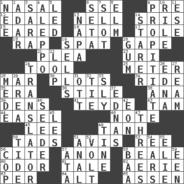ACROSS 1. Relating to the nose 6. Compass dir. 9. Before (prefix) 12. Peak District village in England 13. 1994 drama film starring Jodie Foster 14. Indian titles of respect 15. Having ears or earlike features 16. Tiny particle 17. Lacquered or enameled metalware 18. Hit sharply and swiftly 19. Petty quarrel 20. Yawn 21. Entreaty 23. RI univ. 24. Instrument 25. Distance measurement 28. Third mo. 30. Schemes 34. Travel on or in a vehicle 35. Period 36. Vertical member of a panel or frame 38. Santa ___, CA 39. Habitations of wild animals 41. Miss Universe 1986, Barbara Palacios _ 43. Scottish cap 44. Artist's stand 46. Observe 48. Area sheltered from the wind 49. Hyperbolic tangent 50. Bits 51. Deliberation 53. To sift 56. Quote 57. At once, immediately (arch.) 58. Memphis, Tenn. Street 60. Aroma 61. Falsehood 62. Nest on high 63. For each 64. The first octave above the treble staff 65. NE Netherlands city DOWN 1. Born 2. The sixth month of the Jewish calendar 3. "Two Mules for Sister ____" 4. City in Syria 5. Directed 6. Bristle 7. Groove 8. Shade tree 9. Appease 10. Cause heat under the collar 11. Compass dir. 13. California wine valley 14. A viewer who gazes fixedly 19. Exchanges for money 20. Chewing product 22. Chop off 24. Interpreter 26. Pulitzer Prize-winning author Ferber 27. 480, 500 or 516 sheets of paper 28. Ancient Persian 29. Length times width 31. Baseball player Mel 32. Neckwear 33. Wily 37. Ferber et al. 40. Sowing specialist 42. A really long time 45. French article 47. Threesomes 49. Prong on a fork 50. Event that recurs at intervals 51. Of or related to the anus 52. Electrical Unit 54. Hearing organs 55. Writer Wiesel 56. Police officer (slang) 57. "One Day ___ Time" 58. Sound made by sheep 59. Car or cant ending