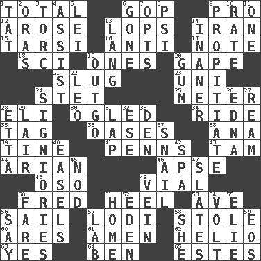 ACROSS 1. "_____ Recall" 6. Republican Party 9. Adept person 12. Came up 13. Chops off 14. SW Asia republic 15. Tarsus (plural) 16. Opposed to 17. Musical sound 18. _-fi 19. Washington bills 20. Open wide 21. Strike heavily 23. Single; one (prefix) 24. Proofreading order 25. Distance measurement 28. Connecticut Ivy Leaguer 30. Stared 34. Travel on or in a vehicle 35. Label 36. Fertile tracts in a desert 38. Santa ___, CA 39. Prong on a fork 41. Actor Sean's family 43. Scottish cap 44. Believer in; advocate of (suffix) 46. Domed church section 48. Bear (Spanish) 49. Small bottle 50. Flintstone 51. The bottom of a shoe or boot 53. "___ Maria" 56. Travel by water 57. Farming town in central California 58. Fur scarf 60. Ancient Greek god of war 61. So be it 62. Sun: prefix 63. It is so 64. Benjamin's nick name 65. _____ Park, CO DOWN 1. Make lace 2. Mouths or openings 3. Torque (variant) 4. Aid 5. Luau accessory 6. Went 7. Elects 8. Air pressure measure (abbr.) 9. Conciliate 10. Pace 11. Single 13. Austrian-born American filmmaker Fritz 14. More empty; more void 19. Outlay 20. Chewing product 22. Lion 24. Seigniories (variant) 26. Pulitzer Prize-winning author Ferber 27. 480, 500 or 516 sheets of paper 28. Singer James 29. Den 31. Pet locale 32. Compass dir. 33. Lair 37. Slow-paced one 40. Artist's stands 42. Health resort 45. Dreamland 47. Chalkboards 49. Distinctive style or manner 50. Conductor's collection 51. Dwelling 52. Locale of original sin 54. Electrical Unit 55. Writer Wiesel 56. Declare 57. Experiment locale 58. A female animal or person 59. Greek goddess of the dawn