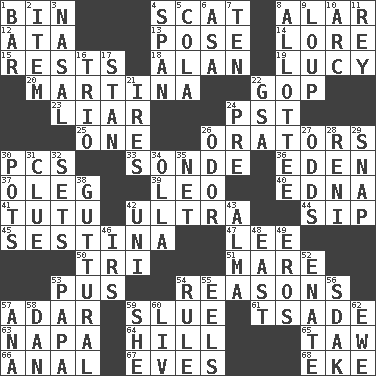 ACROSS 1. Storage container 4. Scram, to a cat 8. Having or resembling wings 12. "One Day ___ Time" 13. Airs 14. Old wives' tales, e.g. 15. Musical pauses 18. ____ Jay Lerner 19. "I Love _" 20. Chrissie's court nemesis 22. Grand Old Party 23. One who doesn't tell the truth 24. Pacific Standard Time (abbr.) 25. Single 26. Speakers 30. Personal Computers (abbr.) 33. Something which is sent 36. Locale of original sin 37. Cassini of fashion 39. Lion 40. Pulitzer Prize-winning author Ferber 41. Ballerina skirt 42. Extreme 44. Small drink 45. French poetic form 47. Area sheltered from the wind 50. Three (prefix) 51. Female horse 53. Fluid product of inflammation 54. Thinks logically 57. The sixth month of the Jewish calendar 59. Turn sharply 61. Sadhe (variant) 63. California wine valley 64. Land elevation 65. The 23rd letter of the Hebrew alphabet 66. Of or related to the anus 67. Nights before holidays 68. Supplement with great effort DOWN 1. Long, evenly shaped piece 2. A distinct part 3. Rhinal 4. Connect, as a bridge 5. Root beer relative 6. White ___ sheet 7. "___ Little Indians" 8. One to whom something is allotted 9. Central Nebraska county 10. Curve 11. Marina Del _, California 16. Musical group of three 17. Comedian Laurel of Laurel & Hardy 21. Angers 22. Girls' org. (abbr.) 24. Before (prefix) 26. Scent 27. Probability 28. Painter Guido (1575-1642) 29. Fastener 30. Cooking vessels 31. A slight indication 32. Puts into a specified state 34. Water jar 35. Fish or hair follower 38. From the throat 42. University (slang) 43. _ mater 46. Big collection agency 48. Compass direction 49. Greek god of love 52. Maternal 53. Dad 54. Court order 55. Snakelike fish 56. Neighbor of Neb. 57. Santa ___, CA 58. One of the 12 tribes of Israel 59. A female animal or person 60. 54 in ancient Rome 62. She-sheep