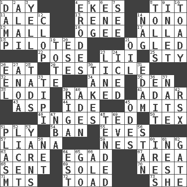ACROSS 1. 24 hours 4. Supplements with great effort 8. Teat (slang) 11. Actor Baldwin 13. French philosopher Descartes 14. Words to Nanette 15. Promenade 16. Double curve, resembling the letter S 17. Silent film actress Nazimova 18. Manned the helm 21. Stared 22. Introduce or present, as a question 23. Cards in a Roman deck? 25. Filthy place 26. Erode 29. One of the two male reproductive glands 32. Maternal 34. A saturated hydrocarbon 35. Lair 38. Farming town in central California 39. Moved through 41. The sixth month of the Jewish calendar 43. Viper 44. Binary compound 45. Leaves out 46. Swallowed 50. John Ritter's dad 51. Apply oneself diligently 54. Bar 55. Nights before holidays 57. Woody, climbing, usually tropical plant 59. Snuggling 63. 1/640 square mile 64. Mild oath 67. Length times width 68. Emitted 69. Not divided or shared with others 70. A home for chicks 71. Mountains (abbr.) 72. Frog relative 73. A female animal or person DOWN 1. Moist 2. Mountain range southwest of Kyrgyzstan 3. Shout 4. Eats (away) 5. Barrel 6. Compass dir. 7. Observe 8. For Whom the Bell _____ 9. An arm off of a larger body of water 10. Sycophant 12. Hoof sound 14. Tired old horse 19. Carryall 20. Compass dir. 21. Lubricate 23. Actor's bit 24. On the rocks 26. Snakelike fish 27. Small Philippine buffalo 28. Small boys 30. Proceeds 31. Dutch treat 33. Native american tent (variation) 36. Prepare for publication 37. Nathan's nickname 39. Capital of Latvia 40. Arabian gulf 42. Acura sports coupe 45. Lyric poems 47. Basketball assoc. 48. Watched over 49. First lady 51. Suffix with ecto or cyto 52. It is permitted: Lat. 53. Entertaining tales 56. Comedian Laurel of Laurel & Hardy 58. Fish or hair follower 60. Angers 61. Tender 62. Yard entry 64. Eastern Standard Time (abbr.) 65. Thick or sticky substance 66. Wing