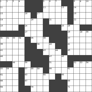 ACROSS 1. Otherwise 5. "___ Little Indians" 8. Coat; cloak 11. South Vietnam president (1954) 12. Greek god of love 14. Alias (abbr.) 15. With great haste 17. Thick mixture 18. Mouth edge 19. Small, flat, pigmented spot on the skin 21. Car or cant ending 22. Area sheltered from the wind 23. Double-curved letter 24. Chop off 25. Make lace 27. Snakelike fish 28. Soap units 31. Table seasoning 35. Title for a knight 37. Toward shelter 38. Length times width 39. Modern: prefix 41. Penny 42. Lightbulb-shaped fruit 43. Epoch 45. Toward the sea 46. Fast planes 47. In the manner of 49. Part of HMS, perhaps 51. Scottish cap 52. Ocean 55. Purpose 57. "We ___ not amused" (Victoria) 60. Speakers 62. Automobile 63. Sir (Sp.) 65. Rings 66. Falsehood 67. Soap bubbles 68. Ancient Persian 69. Say or write further 70. Oct. 31 cry 71. Paradise DOWN 1. Peak District village in England 2. Citrus fruits 3. Seines 4. Send forth 5. Afternoon social gathering 6. Celtic language 7. Observe 8. Baron Munchausen's specialties 9. Migrant worker of the '30s 10. Open wide 13. Transmitted 16. Mediterranean tributary 17. Cotton for raincoats, e.g. 20. Travels 26. Phillipine bananalike plant 29. French philosopher Descartes 30. Stalk of a moss capsule 31. Plant excrements 32. Ancient Greek god of war 33. Tough but pliablecoriaceous 34. Tarsus (plural) 36. To separate or throw off 40. Speaker 44. Having or resembling wings 48. Nursemaid 50. Backtalk 52. Having a sole or soles 53. Eat (away) 54. NE Netherlands city 55. Southern CA. univ. 56. Alleged 58. Reuben's nickname 59. Inside; within (prefix) 61. Not wild 64. Bear (Spanish)