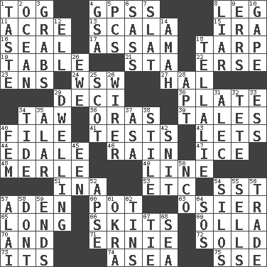 ACROSS 1. Coat; cloak 4. Global Positioning Systems (abbr.) 8. Part of a journey 11. 43,560 square feet 13. Any of the three canals of the cochlea 15. Lyricist Gershwin 16. Lick closed 17. Indian state 18. Canvas cover 19. Eating place 21. R.R. building 22. Celtic language 23. Followers of ems 24. Compass dir. 27. Actor Linden 29. Tenth: prefix 30. Food holder 34. The 23rd letter of the Hebrew alphabet 36. Mouths or openings 39. Lies 40. Do some clerical work 41. Trials 43. Allows 44. Peak District village in England 46. Water falling in drops from the sky 47. Frozen water 48. Haggard of country music 49. Actor's bit 51. _ tizzy (2 wds.) 53. And so on (abbr.) 54. Fast jet (abbr.) 57. An important port of Yemen 60. Cooking vessel 63. Flexible twig of a willow tree 65. Protracted 66. Burlesque acts 69. Spanish pot 70. Added to 71. Bert's buddy 72. Exchanged or delivered for money 73. ___ a Wonderful Life 74. Toward the sea 75. Compass dir. DOWN 1. Clothes sense 2. Sea 3. Catches 4. Girls' org. (abbr.) 5. Personal Computers (abbr.) 6. Backtalk 7. Narrow board 8. One who doesn't tell the truth 9. Blunders 10. Open wide 12. Pipe bend 14. Housemaid 18. Copy Pinocchio 20. She-sheep 25. Native of Scotland 26. One who wires 28. Fitting 29. Residence 31. Actor Baldwin 32. Wig 33. Double-curved letter 34. Periodic rise and fall of the sea level 35. Having or resembling wings 37. White ___ sheet 38. Vertical member of a panel or frame 40. Opposite of masc. 42. In a ____ (agitated or irritated) 45. Car or cant ending 50. Non-commissioned officer (abbr.) 52. Domed church section 54. Grain storage towers 55. Exchanges for money 56. Barter 57. Jai ____ 58. Do not 59. Conclusions 61. Gumbo ingredient 62. Metal containers 64. Distress signal 67. Standoff 68. Ocean