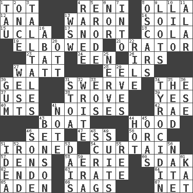 ACROSS 1. Small child 4. Painter Guido (1575-1642) 8. Water jar 12. Santa ___, CA 13. Make _____ (do battle with) 14. The visible part of the earth's surface 15. Southern CA. univ. 17. Derisive sound 18. Root beer relative 19. Turned at an angle; bent 21. Speaker 23. Make lace 24. Car or cant ending 26. Big collection agency 27. Electrical Unit 28. Snakelike fish 30. Set 31. Turn aside suddenly 34. Definite Article 37. Purpose 38. Collection of objects 39. Affirmative reply 40. Mountains (abbr.) 41. Annoying sounds 42. Actress Charlotte 43. Water vessel 44. Parka part 46. Put into a specified state 47. Double-curved letter 50. The grampus (Milton) 51. Pressed 54. Window treatment 57. Habitations of wild animals 58. Nest on high 60. Neighbor of Neb. 62. Inside; within (prefix) 63. Feeling or showing extreme anger 64. Call ___ day 65. Arabian gulf 66. Sinks 67. Fish or hair follower DOWN 1. The 19th letter of the Greek alphabet 2. At one time in the past 3. Baron Munchausen's specialties 4. Indian princess (variant) 5. Wear away 6. And not 7. To the inside or interior of 8. Motion picture awards 9. Plunders 10. _ and Stitch 11. Having or resembling wings 13. Compass dir. 16. Blind as ____ 20. Baseball player Mel 22. Cause heat under the collar 25. Effrontery 27. 270 degrees 29. Nights before holidays 30. Chewing product 31. Portico 32. Compose 33. Greek goddess of the dawn 34. Polypeptide antibiotic 35. Froth on beer 36. Compass dir. 41. Brief written record 43. Gillaume's butler role 44. Being at a high temperature 45. Mouths or openings 46. Something which is sent 48. Strangle with an iron collar 49. Sets or collections 51. The content of cognition 52. Tear apart 53. Raised platform 55. To separate or throw off 56. Nathan's nickname 59. Period 61. Krazy ___ of comics