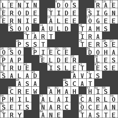 ACROSS 1. Soviet premier 1918-24 6. Two (Sp.) 9. Actress Charlotte 12. Wear away 13. Event that recurs at intervals 14. Public display of a written message 15. Bert's buddy 16. Toward shelter 17. Double curve, resembling the letter S 18. "Barney Miller" actor Jack 19. Old (Scot.) 20. Scottish caps 21. Small pie 23. Retirement account (abbr.) 24. Inconspicuous attention getter 25. Laconic 28. Bear (Spanish) 30. Part 34. Capital of the state of Qatar 35. Infant food 36. A person who is older than you are 38. French article 39. Loyal 41. Small island 43. Compass dir. 44. First course 46. Opinion 48. White ___ sheet 49. Jazz singing style 50. Group working together 51. Housemaid 53. Part of HMS, perhaps 56. Silvers or Donahue 57. Jai _ 58. Monte _, Las Vegas Hotel/Casino 60. Puts into a specified state 61. Drug cop 62. Sea 63. Attempt to accomplish something 64. A saturated hydrocarbon 65. Clothes sense DOWN 1. Area sheltered from the wind 2. Blunders 3. Words to Nanette 4. Foolish or stupid persons 5. Born 6. Deli pickle 7. Wrote a lyric poem 8. Perceive with the eye 9. Complicated, petty procedures 10. Eras 11. Compass dir. 13. Drawn tight 14. Flew 19. Nick name for Arthur 20. Teat (slang) 22. Cleo's killer 24. Teen's desire 26. "______ My Girl" (Turtles hit) 27. Comfort 28. Elects 29. "Two Mules for Sister ____" 31. Biblical high priest 32. Music discs 33. Snakelike fish 37. Arrive at 40. Artist's stands 42. Federal power corp. 45. Simpleton 47. New York city 49. Ketch in the Levant 50. "Mermaids" star 51. Actor Alda or Thicke 52. Female horse 54. Angers 55. Narrow board 56. Pacific Standard Time (abbr.) 57. Santa ___, CA 58. Small bed 59. Single