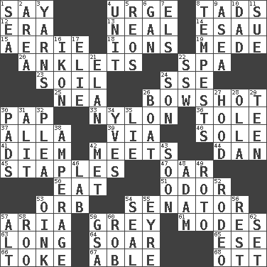 ACROSS 1. Declare 4. Goad 8. Small amounts or degrees 12. Epoch 13. Be tempered by heat 14. Son of Isaac 15. Nest on high 18. Charged atoms 19. Ancient Persian 20. Short socks 22. Health resort 23. The visible part of the earth's surface 24. Compass dir. 25. Teachers' org. 26. The distance a bow sends an arrow 30. Infant food 33. High-strength synthetic material 36. Lacquered or enameled metalware 37. Silent film actress Nazimova 39. By way of 40. Flatfish 41. South Vietnam president (1954) 42. Confronts 44. One of the 12 tribes of Israel 45. Paper fasteners 47. Rowing implement 50. Ingest 51. Scent 53. Globe 54. Legislator 57. Roberta Peters solo 59. Jennifer or Joel 61. Methods 63. Yearn 64. Fly high 65. Compass dir. 66. Casino tip 67. Competent 68. Baseball player Mel DOWN 1. Ocean 2. Length times width 3. Tall tales 4. A single undivided whole 5. Vintage cars 6. Separate the seeds from cotton 7. Raised railways 8. Storms 9. Toward the sea 10. June honoree 11. Institute legal proceedings 16. Image 17. Writer Wiesel 21. Flair 22. Compass dir. 24. Manchild 26. Water vessel 27. Parka part 28. Rounded earthenware pot or jar 29. Adolescent 30. Groovy apts. 31. Came down and settled, as after flight 32. Entreaty 34. Jacques Cousteau's middle name 35. Whopper 38. Electrical Measurement 42. Was introduced to 43. Within a short period 46. Experiment locale 48. First of billions? 49. Printing process, for short 52. Cowboy competition 53. Pig sound 54. Lick closed 55. Jane of fiction 56. Take ten 57. The first octave above the treble staff 58. Friend of Pooh 59. Girls' org. (abbr.) 60. Director Reiner 62. Arrange properly for use