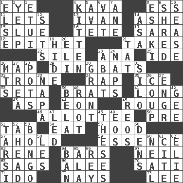 ACROSS 1. Sight organ 4. Polynesian shrub of the pepper family 8. Double-curved letter 11. Allows 13. _ the terrible 14. American tennis player Robert 15. Change direction abruptly 16. Wig 17. "Two Mules for Sister ____" 18. Curse 21. Proceeds 22. Filth; sediment 23. Nanny (var.) 25. Binary compound 26. Atlas unit 29. Empty-headed or silly people 32. Marketplace scale 34. Strike 35. Frozen water 38. Bristle 39. Naughty children 41. Protracted 43. Cleo's killer 44. Period of immesurable duration 45. Makeup applied to the cheeks 46. One to whom something is allotted 50. Before (prefix) 51. Bar bill 54. Consume 55. Parka part 57. Hold, grip (Informal) 59. Core 63. French philosopher Descartes 64. Soap units 67. Famous astronaut Armstrong 68. Droops 69. Toward shelter 70. Suttee (variant) 71. Wedding promise 72. Negative votes 73. Area sheltered from the wind DOWN 1. Otherwise 2. Sharp bark 3. Needle holder 4. Baby cat 5. "___ Maria" 6. Large container 7. One (Scot) 8. 1973 Nobel Price Winner (Physics) Leo 9. Fragment 10. Gospel singer Marvin 12. Puts into a specified state 14. White ___ sheet 19. Flintstone garb 20. Connecticut Ivy Leaguer 21. Make lace 23. Blind as ____ 24. Atlas contents 26. Mountains (abbr.) 27. Type of rug 28. Cooking vessels 30. Monetary aid 31. Grain storage tower 33. California wine valley 36. Overturn; upset 37. Engineer (abbr.) 39. Actor Lugosi 40. Carrot, for example 42. Unit of force equal to gravity 45. Vintage cars 47. Directed 48. College papers 49. Greek goddess of the dawn 51. Tarsus (plural) 52. Toward the future 53. Beat drum 56. Hiding places for outlaws 58. French article 60. Anneal 61. Quote 62. Writer Wiesel 64. Prohibit 65. In the manner of 66. Marina Del _, California