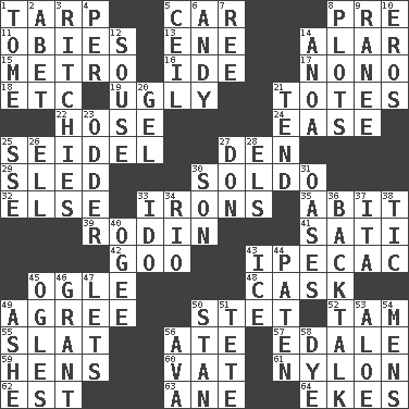 ACROSS 1. Canvas cover 5. Auto 8. Before (prefix) 11. Off-Broadway awards 13. Compass dir. 14. Having or resembling wings 15. Paris' subway 16. Binary compound 17. Words to Nanette 18. And so on (abbr.) 19. Repulsive 21. Lugs 22. Stockings 24. Relaxation 25. Beer mug 27. Lair 29. Downhill vehicle 30. Twentieth part of a lira 32. Otherwise 33. Metal shackles 35. "This won't hurt ____!" 39. "The Thinker" sculptor 41. Suttee (variant) 42. Thick or sticky substance 43. Medicinal drug used to evoke vomiting 45. Stare at amorously 48. Keg 49. Match 50. Proofreading order 52. Scottish cap 55. Narrow board 56. Had dinner 57. Peak District village in England 59. Coop moms 60. Large container 61. High-strength synthetic material 62. Eastern Standard Time (abbr.) 63. One (Scot) 64. Makes supply last DOWN 1. Heavy book 2. Collude with 3. Actors Guy, Robert Welles, and Clint 4. For each 5. To provide with a ceiling 6. Actor Griffith 7. To separate or throw off 8. Secret plans 9. The wife of a rajah (variant) 10. Greek god of love 12. Lush 14. Small Philippine buffalo 20. Set 21. Be inclined (to) 23. More peculiar 25. Compass dir. 26. Pipe bend 27. Spanish title 28. Raised railways 30. Male offspring 31. Fertile tracts in a desert 33. Wedding promise 34. _ de Janeiro 36. Sass 37. Call ___ day 38. Nervous spasm 40. Double curve, resembling the letter S 43. Frozen water 44. Eucharist need 45. Stares 46. Monetary aid 47. Allows 49. American tennis player Robert 50. Comedian Laurel of Laurel & Hardy 51. False hair 53. _ vera 54. Not women's 56. Actress Gardner 58. Color