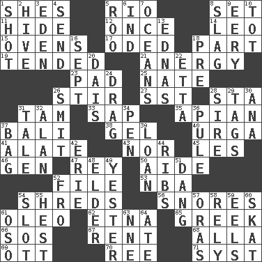ACROSS 1. "______ My Girl" (Turtles hit) 5. River (Sp.) 8. Put into a specified state 11. Flintstone garb 12. Single time 14. Lion 15. Baking chambers 17. Wrote a lyric poem 18. Piece 19. Watched over 21. Disorder of the immune system 23. Writing tablet 25. Nathan's nickname 26. Disorderly outburst 27. Fast jet (abbr.) 28. R.R. building 31. Scottish cap 33. Plant excrement 35. Bee-related 37. Indonesian resort city 38. Set 40. Capital and largest city of Mongolia 41. Having winglike extensions 43. And not 45. French article 46. Commissioned military rank (abbr.) 47. Marina Del _, California 50. Helper 52. Do some clerical work 53. Basketball assoc. 54. Fragments 56. Sounds asleep 61. Margarine 62. Inactive volcano in Sicily 65. Of Greece 66. Distress signal 67. Monthly bill 68. Silent film actress Nazimova 69. Baseball player Mel 70. To separate or throw off 71. System (abbr.) DOWN 1. Attempt 2. Hub of activity 3. Paradise 4. Post 5. Friend of Pooh 6. Indiana (abbr.) 7. Seas 8. Volcanic refuse 9. Suggestive of the supernatural 10. Small child 13. Ferber et al. 16. Back-to-school mo. 18. Before (prefix) 20. Raised platform 22. Singer James 24. To draw with force 26. Stricken, poetically 28. Father 29. Labels 30. Santa ___, CA 31. Falsehood 32. ____ Jay Lerner 34. Writing instrument 36. Whimper 37. Paper or plastic container 39. Grant temporary use of 42. 4th largest of the Great Lakes 44. Chest bones 48. A person who is older than you are 49. Next before 51. Mild oath, euphamism for damn 52. From 54. Narrow, elongated depression 55. Behest 57. Mouths or openings 58. Have trust in 59. Snakelike fish 60. Three-handed card game 61. Bear (Spanish) 63. Compass dir. 64. Had dinner