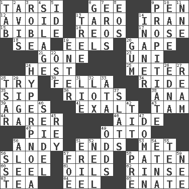 ACROSS 1. Tarsus (plural) 6. Turn to the right 9. Animal enclosure 12. Keep away from 13. Pacific island yam 14. SW Asia republic 15. God's Word 16. Vintage cars 17. Olfactory organ 18. Ocean 19. Snakelike fish 20. Stare wonderingly 21. Went 23. University (slang) 24. Behest 25. Distance measurement 28. Attempt 30. Chap (slang) 34. Travel on or in a vehicle 35. Small drink 36. Debaucheries 38. Santa ___, CA 39. Matures 41. Honor 43. Scottish cap 44. Less widely known 46. Helper 48. Sliced dessert 49. Von Bismarck 50. Actor Griffith 51. Extremities 53. Was introduced to 56. _ gin 57. Flintstone 58. Eucharist need 60. Stitch closed the eyes of (a falcon) 61. Lubricates 62. Wash lightly 63. Afternoon social gathering 64. Snakelike fish 65. Related on the mother's side DOWN 1. Bar bill 2. Deliberation 3. Loose flowing garment 4. Fodder prepared in a silo 5. Binary compound 6. Highlander 7. Greek god of love 8. Greek goddess of the dawn 9. Conciliate 10. Relaxation 11. Compass dir. 13. Woody plant 14. More empty; more void 19. Keyboard key 20. Chewing product 22. Order of Saint Francis (abbr.) 24. Abnormally rapid or deep breathing 26. Pulitzer Prize-winning author Ferber 27. 480, 500 or 516 sheets of paper 28. Russian ruler of old 29. Capital of Latvia 31. Untruth 32. Brine-cured salmon 33. "One Day ___ Time" 37. Narrow boards 40. A glass for beer 42. Teat (slang) 45. Marina Del _, California 47. Kingdom 49. Likelihood 50. Toward shelter 51. 4th largest of the Great Lakes 52. 1994 drama film starring Jodie Foster 54. Inactive volcano in Sicily 55. Trial 56. Fast jet (abbr.) 57. Enemy 58. Before (prefix) 59. Born