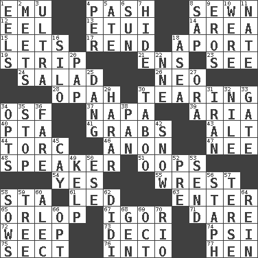 ACROSS 1. Australian flightless bird 4. Romantic infatuation 8. Stitched 12. Snakelike fish 13. Needle holder 14. Type of rug 15. Allows 17. Tear apart 18. To the left, to Queeg 19. Empty completely 21. Followers of ems 23. Observe 24. First course 26. Modern: prefix 28. Brightly colored fish 30. Rending 34. Order of Saint Francis (abbr.) 37. California wine valley 39. Operatic vocal solo 40. Parent Teacher Association (abbr.) 41. Catches 43. The first octave above the treble staff 44. Torque (variant) 46. Soon (poet.) 47. Born 48. Orator 51. I made a mistake 54. It is so 55. Obtain by seizing forcibly or violently 58. R.R. building 61. Directed 63. Keyboard key 65. Fourth or lowest deck 67. Russian composer Stravinsky 71. Have the gumption 72. Shed a tear 73. Tenth: prefix 74. 23rd letter of the Greek alphabet 75. Religious group 76. To the inside or interior of 77. Layer DOWN 1. Snakelike fish 2. Confronts 3. Extremist 4. For each 5. Had dinner 6. Player for Phoenix 7. Flintstone garb 8. Plant excrement 9. Greek god of love 10. Past tense of be (plural) 11. Nathan's nickname 16. Grain storage tower 18. At sea 20. Infant food 22. Compass dir. 25. Mild oath, euphamism for damn 27. Mouth or opening 29. Ethiopian city, capital of Harari 30. Off limits 31. SW Asia republic 32. Mediterranean tributary 33. Yard entry 34. Elects 35. Obstruct or block passage 36. Conductor's collection 38. Baking dish 42. Frozen precipitation 45. Island 49. Seaweed 50. Compass dir. 52. Before (prefix) 53. Transmit 56. Staphylococcus 57. Laconic 58. Sty mamas 59. Relationship diagram 60. Actor Baldwin 62. "You Light Up My Life" star Conn 64. It's straight from the horse's mouth 66. Choose 68. Commissioned mil. rank 69. Sep. follower 70. _ de Janeiro