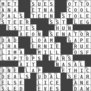 ACROSS 1. Was introduced to 4. Takes to court 8. Von Bismarck 12. Santa ___, CA 13. Inactive volcano in Sicily 14. Calm and collected 15. Friends 17. Adolescent 18. Took without asking 19. Navigate 21. Fast jet (abbr.) 23. Part of a journey 24. _____ Park, CO 26. Attila the _ 28. Period of immesurable duration 30. Elected representative 34. Male parent 37. Rich soil 39. Stare wonderingly 40. Lyricist Gershwin 41. Bert's buddy 43. Regret 44. Pale green bean 46. Place where flour is made 47. Order of Saint Francis (abbr.) 48. Portable computers 51. Hearing organs 54. Small island 55. Rhinal 58. Single 61. Pet locale 63. Value system 65. Allots cards 67. Hereditary estate 71. Singe 72. Otherwise 73. Louse (plural) 74. A saturated hydrocarbon 75. Downhill vehicle 76. Nights before holidays 77. Simpleton DOWN 1. Atlas contents 2. Related on the mother's side 3. Lies 4. Arrange properly for use 5. Shoshoni 6. Compass dir. 7. Without 8. Sep. follower 9. Instrument 10. Lacquered or enameled metalware 11. Cassini of fashion 16. Bristle 18. Surprise greatly 20. Portuguese money of account (variant) 22. A female animal or person 25. Not divided or shared with others 27. Tired old horse 29. Typical standards 30. Grin 31. Edible starchy tuberous root 32. Musical composition 33. Coral ridge 34. Deli pickle 35. Operatic vocal solo 36. Moist 38. Cuckoo 42. Style 45. "One Day ___ Time" 49. Petroleums 50. Parent Teacher Assoc. 52. Actress Charlotte 53. Fast planes 56. Forward in time 57. Woody, climbing, usually tropical plant 58. Lyric poems 59. 1994 drama film starring Jodie Foster 60. Relaxation 62. Whine 64. Ship's personnel 66. Directed 68. HTML Container Element 69. Adept person 70. French article