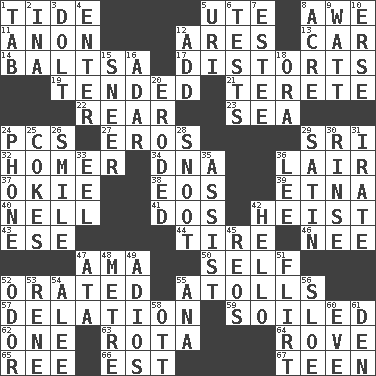 ACROSS 1. Periodic rise and fall of the sea level 5. Shoshoni 8. Deep reverence 11. At once, immediately (arch.) 12. Ancient Greek god of war 13. Auto 14. Greek mezzo-soprano Agnes 17. What propaganda does 19. Looked after 21. Cylindrical with tapered ends 22. Located in or toward the back 23. Ocean 24. Personal Computers (abbr.) 27. Greek god of love 29. _ Lanka 32. Homing pigeon 34. Heredity factor (abbr.) 36. Den 37. Migrant worker of the '30s 38. Greek goddess of the dawn 39. Inactive volcano in Sicily 40. 1994 drama film starring Jodie Foster 41. Two (Sp.) 42. Robbery 43. Compass dir. 44. Hoop that covers a wheel 46. Born 47. Nursemaid (var.) 50. Automatically 52. Declaimed 55. Ringlike coral islands and reefs 57. Accusation by an informer 59. Dirtied 62. Single 63. Round or rotation of duties 64. Be footloose 65. To separate or throw off 66. Eastern Standard Time (abbr.) 67. Adolescent DOWN 1. Keyboard key 2. _ tizzy (2 wds.) 3. Stupid person 4. Keyboard key 5. RI univ. 6. Trials 7. First name in cosmetics 8. 43,560 square feet 9. Electrical Unit 10. Celtic language 12. Say or write further 15. Scornful expression 16. The sixth month of the Jewish calendar 18. Mouth or opening 20. Worn away 24. Give a jingle 25. Popular sodas 26. Grin 28. Snob 29. Smooth fabric 30. Remove soap 31. Feeling or showing extreme anger 33. Snakelike fish 35. Help 36. Area sheltered from the wind 42. Phone greeting 45. Vintage cars 47. _ moment's notice (2 wds.) 48. Distance measurement (Brit.) 49. Goodbye (Sp.) 51. Talk or behave amorously 52. Aroma 53. French philosopher Descartes 54. Toward shelter 55. Santa ___, CA 56. _ gin 58. Baseball player Mel 60. First lady 61. Lair