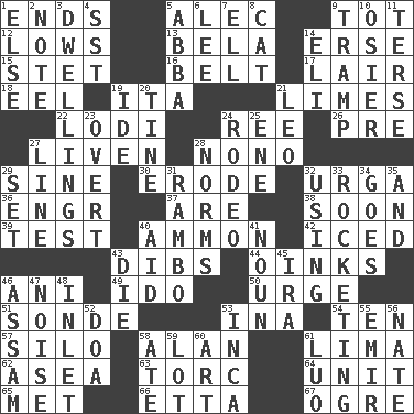 ACROSS 1. Extremities 5. Actor Baldwin 9. Small child 12. Coldest temperatures 13. Actor Lugosi 14. Celtic language 15. Proofreading order 16. Waist strap 17. Den 18. Snakelike fish 19. Call ___ day 21. Citrus fruits 22. Farming town in central California 24. To riddle 26. Before (prefix) 27. Make or become more lively 28. Words to Nanette 29. Trig term 30. Eat (away) 32. Capital and largest city of Mongolia 36. Engineer (abbr.) 37. "We ___ not amused" (Victoria) 38. Within a short period 39. Trial 40. ID or VA city 42. On the rocks 43. Rights 44. Pig sounds 46. Cuckoo 49. Wedding promise 50. Goad 51. Message 53. _ tizzy (2 wds.) 54. "___ Little Indians" 57. Grain storage tower 58. Actor Alda or Thicke 61. Pale green bean 62. Toward the sea 63. Torque (variant) 64. A single undivided whole 65. Was introduced to 66. Singer James 67. Legendary monster DOWN 1. Otherwise 2. Short letter 3. Homes 4. Fast jet (abbr.) 5. Swedish rock group 6. Area sheltered from the wind 7. Pipe bend 8. Feline 9. _____ steamer (cargo ship) 10. Flexible twig of a willow tree 11. Laconic 14. Connecticut Ivy Leaguer 19. Binary compound 20. Prong on a fork 21. Lion 23. Unconcealed 24. Cowboy competition 25. Compass dir. 27. Actor's bit 28. Typical models 29. Arrange properly for use 31. Role for Stallone 32. Putting into practice 33. Shooting up abruptly 34. Travels 35. Added to 40. Help 41. Part of speech 43. Expire 45. Retirement account (abbr.) 46. Indian state 47. Annoying sound 48. An arm off of a larger body of water 52. ___ good deed 53. South American Indian 55. Arab leader 56. Nathan's nickname 58. Had dinner 59. Car dealer's back yard 60. Nonscientific branch of learning 61. Nilotic language