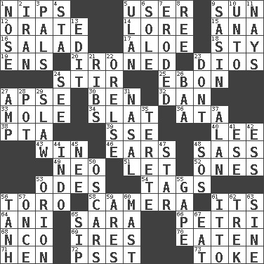 ACROSS 1. Cuts off 5. One who makes use of a thing 9. Player for Phoenix 12. Declaim 14. Old wives' tales, e.g. 15. Santa ___, CA 16. Vegetable dish 17. _ vera 18. Filthy place 19. Followers of ems 20. Pressed 23. "Vaya con ____" 24. Move through with a circular motion 25. Inky black, to poets 27. Domed church section 30. Benjamin's nick name 32. Daniel's nick name 33. Undercover agent 34. Narrow board 36. _ moment's notice (2 wds.) 38. Parent Teacher Association (abbr.) 39. Compass dir. 40. Area sheltered from the wind 43. Acquire through effort 46. Hearing organs 48. Backtalk 49. Modern: prefix 51. Allow 52. Washington bills 53. Lyric poems 54. Labels 56. "Corrida" creature 58. Device for capturing images 61. It is 64. Black tropical American cuckoo 65. "Two Mules for Sister ____" 66. _ dish (used to culture cells) 68. Non-commissioned officer (abbr.) 69. Angers 70. Consumed 71. Layer 72. Inconspicuous attention getter 73. Casino tip DOWN 1. Characteristic smell of wine 2. SW Asia republic 3. Friends 4. R.R. building 5. Uhlan (variant) 6. Not divided or shared with others 7. Eaten away 8. To separate or throw off 9. Indian antelope 10. To (old English) 11. Negative votes 13. Prepare for publication 21. Teases 22. Threatening words 23. Do not 24. Perceive with the eye 26. Sound made by sheep 27. Electrical Unit 28. Plant holder 29. Cole _ (cabbage dish) 31. Rhinal 35. Cigar-shaped 37. ____ Jay Lerner 41. Compass dir. 42. Curvy letter 44. _ china 45. Born 47. Play the lead 48. Mayday 50. Motion picture awards 53. Constellation of myth 55. Yawn 56. Hyperbolic tangent 57. At one time in the past 59. Ancient Greek god of war 60. Vertical spar for supporting sails 61. "Tell ____ the Marines!" 62. Long journey 63. Trig term 65. Small drink 67. Ingest