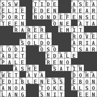 ACROSS 1. Compass dir. 4. Event that recurs at intervals 8. At sea 12. Writer Wiesel 14. Paradise 15. Posterior 16. Left side of a ship or aircraft 17. Unrelated to defense, as in spending 20. Adolescent 21. Single 22. "One Day ___ Time" 23. More valued for its uncommonness 27. Give off 29. Person who is morally reprehensible 31. Be footloose 34. Twentieth part of a lira 35. Operatic vocal solo 36. Farming town in central California 39. Bear (Spanish) 41. Russian ruler of old 42. Collude with 43. Peak District village in England 46. Light colored 47. Western Nevada city 48. American tennis player Robert 51. Smooth fabric 54. Dripping 56. Actress Gardner 58. Capital of the state of Qatar 61. The property of being fit to eat 66. Inky black, to poets 67. Small Philippine buffalo 68. Casino tip 69. In addition 70. Long (Scottish) 71. In a ____ (agitated or irritated) 72. Car or cant ending DOWN 1. Back-to-school mo. 2. A type of plum 3. One who wires 4. Nine, plus one 5. Wedding promise 6. Lair 7. Inside; within (prefix) 8. "We ___ not amused" (Victoria) 9. Elected representatives 10. 90 degrees 11. Length times width 13. Inactive volcano in Sicily 18. Compass dir. 19. Opposite of masc. 24. 17th letter of the Greek alphabet 25. Snakelike fish 26. Do over again 28. Feeling or showing extreme anger 30. Failure 32. By way of 33. Hearing organ 34. Locates 36. Pet locale 37. Chief or king in Benin or Nigeria 38. Conveyance 40. Lyric poems 44. Santa ___, CA 45. Car dealer's back yard 49. Actor Linden 50. First lady 52. It may be bright or harebrained 53. Having high moral qualities 54. Welt 55. Pulitzer Prize-winning author Ferber 57. Pismires 59. Stockings 60. Soon (poet.) 62. Paper or plastic container 63. Period of immesurable duration 64. What Jean-Claude Killy likes to do 65. Arrange properly for use
