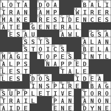 ACROSS 1. Globular water bottle used in Asia 5. ___ good deed 8. Indonesian resort city 12. SW Asia republic 13. Electrical Unit 14. One who wires 15. Create 16. Dwellings 19. Had dinner 20. Commissioned military rank 21. He sold his birthright 23. Leather borer 24. Girls' org. (abbr.) 27. Fast planes 30. ____ Jay Lerner 31. Unemotional ones 34. Actor Lugosi 35. Wise men 38. Drinks excessively 40. International (abbr.) 41. High mountains 42. Slept 44. For fear that 45. Falsehood 46. French article 47. Two (Sp.) 50. It may be bright or harebrained 53. Stimulate to action 57. Paper or plastic container 59. Supplementary 63. "Corrida" creature 64. Go after with the intent to catch 65. Baking dish 66. At once, immediately (arch.) 67. Helper 68. Compass dir. 69. Centimeter-gram-second unit of force DOWN 1. Pale green bean 2. Declaim 3. Receives possession of 4. One (Scot) 5. Have the gumption 6. Presage 7. Domed church section 8. Storage container 9. Curve 10. Area sheltered from the wind 11. Big collection agency 14. Water source 17. Retirement account (abbr.) 18. Fool 20. Abrupt rush of wind 22. Aid 24. Small, secluded valley 25. Table seasoning 26. Of or related to the anus 28. Small child 29. The Jewish people; Israel 30. Remained 32. Numbers guy (abbr.) 33. Back-to-school mo. 35. Promenade 36. Toward shelter 37. Global Positioning Systems (abbr.) 39. Health resort 43. Writer Wiesel 47. Deli pickle 48. Single 49. Fast jet (abbr.) 51. Dark wood 52. Composer Copland 54. Corncob 55. _ the terrible 56. French philosopher Descartes 58. Went 59. R.R. building 60. RI univ. 61. Writing tablet 62. Sliced dessert 63. Small amount or degree
