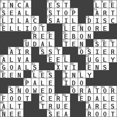 ACROSS 1. South American Indian 5. Eastern Standard Time (abbr.) 8. Area sheltered from the wind 11. Lick closed 12. Halt 14. Nonscientific branch of learning 15. Pale purple color 17. Move on water 18. Compact _ 19. American author Paul (1891-1958) 21. Poe poem 23. To separate or throw off 25. Inky black, to poets 26. Freehold land 27. Nine, plus one 28. Put into a specified state 31. Wind 33. Fast jet (abbr.) 35. Flexible twig of a willow tree 37. Inventor's middle name 38. Snakelike fish 40. Unsightly 41. Purposes of endeavors 43. 16 45. Followers of ems 46. Car or cant ending 47. French article 50. Inwardly 52. Light colored 53. Wedding promise 54. Frozen precipiation fell 56. Speaker 61. Pick up the tab 62. Foregone conclusion 65. Peak District village in England 66. Keyboard modifier key 67. Loyal 68. Ancient Greek god of war 69. Born 70. Ocean 71. Carrot, for example DOWN 1. Small island 2. Famous astronaut Armstrong 3. Give a ring to 4. Jai ____ 5. Double-curved letter 6. R.R. building 7. Bathroom plumbing fixture 8. Den 9. Celtic language 10. And so on (abbr.) 13. Cadet 16. Drawstring 18. Spanish title 20. Afternoon social gatherings 22. Words to Nanette 24. Otherwise 26. Mountain range 28. Attach a signature 29. Snakelike fish 30. Attempt to accomplish something 31. Medicinal plant 32. _ the terrible 34. John Ritter's dad 36. Chop _ 37. Ripen 39. 57 in ancient Rome 42. Cole _ (cabbage dish) 44. Southeast Asian peninsula 48. Voters do this 49. Spring feasts 51. Old wives' tales, e.g. 52. Cooking vessel 54. Not divided or shared with others 55. Musical sound 57. The sixth month of the Jewish calendar 58. Edible starchy tuberous root 59. Margarine 60. Remainder 61. Air blower 63. Regret 64. Afternoon social gathering
