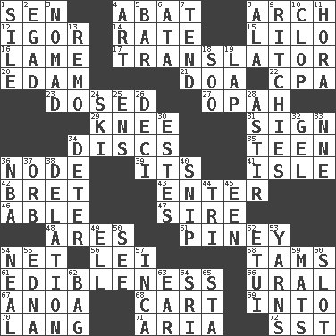 ACROSS 1. Elected rep. 4. Blind as ____ 8. Bowlike part 12. Russian composer Stravinsky 14. Pace 15. _ and Stitch 16. Unable to walk 17. Interpreter 20. Dutch treat 21. ___ good deed 22. Accounting whiz (abbr.) 23. Administered medicine 27. Brightly colored fish 29. Leg joint 31. Attach a signature 34. Flat circles 35. Adolescent 36. Connecting point 39. ___ a Wonderful Life 41. Small island 42. Cy Young winner Saberhagen 43. Keyboard key 46. Competent 47. Father 48. Ancient Greek god of war 51. Abounding in pines 54. Fish or hair follower 56. Flowery wreath 58. Scottish caps 61. The property of being fit to eat 66. Mountain range 67. Small Philippine buffalo 68. Draw slowly or heavily 69. To the inside or interior of 70. Austrian-born American filmmaker Fritz 71. Roberta Peters solo 72. Fast jet (abbr.) DOWN 1. Filth; sediment 2. Mild oath 3. Roamer 4. Nonscientific branch of learning 5. Drinking establishment 6. _ moment's notice (2 wds.) 7. Look after 8. Insect wing 9. Actors Guy, Robert Welles, and Clint 10. Hoof sound 11. Israeli folk dance 13. San ____ (Riviera town) 18. "Barney Miller" actor Jack 19. Pet locale 24. What Jean-Claude Killy likes to do 25. Followers of ems 26. Tenth: prefix 28. Having gotten out of bed 30. _____ Park, CO 32. Set 33. Compass dir. 34. Prevent from occurring 36. Basketball assoc. 37. Globe 38. Accusation by an informer 40. Sever or remove by pinching or nipping 44. Three (prefix) 45. Car or cant ending 49. Pipe bend 50. Perceive with the eye 52. Needle case 53. Entertaining tales 54. Be tempered by heat 55. Pulitzer Prize-winning author Ferber 57. South American Indian 59. Floor coverings 60. Narrow, elongated depression 62. Paper or plastic container 63. Ewer handle 64. _ Lanka 65. R.R. building