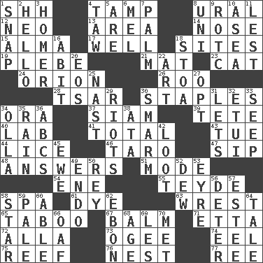 ACROSS 1. Quiet! 4. Pack (down) 8. Mountain range 12. Modern: prefix 13. Type of rug 14. Olfactory organ 15. _ mater 17. Not ill 18. Locates 19. First-year military academy student 21. Floor covering 23. Domesticated feline 24. Greek mythologigal hunter 26. Friend of Pooh 28. Russian ruler of old 30. Paper fasteners 34. Mouth or opening 37. Thailand, formerly 39. Wig 40. Experiment locale 41. Add up to 43. Third day of the wk. 44. Louse (plural) 46. Pacific island yam 47. Small drink 48. Responds (to) 51. Method 54. Compass dir. 55. Miss Universe 1986, Barbara Palacios _ 58. Health resort 61. Color 63. Obtain by seizing forcibly or violently 65. Off limits 67. Lip ointment 71. Singer James 72. Silent film actress Nazimova 73. Double curve, resembling the letter S 74. Snakelike fish 75. Coral collection 76. A home for chicks 77. To separate or throw off DOWN 1. Fastener 2. Phone greeting 3. Simpsons dad 4. The 23rd letter of the Hebrew alphabet 5. "We ___ not amused" (Victoria) 6. Cartoonist voice _ Blanc 7. Inside of hand 8. Corn or form start 9. College mil. group 10. At sea 11. For fear that 16. "This won't hurt ____!" 18. Portico 20. Greek goddess of the dawn 22. Nonscientific branch of learning 25. Political cartoonist Thomas 27. Choose 29. Debaucheries 30. Excessive but superficial compliments 31. Allows 32. Needle case 33. Ooze 34. Rounded earthenware pot or jar 35. Precipitation 36. Lettered men learn these first 38. "One Day ___ Time" 42. Spoils 45. She-sheep 49. Inside; within (prefix) 50. Marina Del _, California 52. Morning condensation 53. Jane of fiction 56. Prevent from occurring 57. First name in cosmetics 58. Play the lead 59. Light colored 60. Competent 62. Inky black, to poets 64. Story 66. Clumsy lout 68. Ripen 69. French article 70. Was introduced to