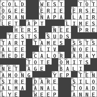 ACROSS 1. Chilled 5. 270 degrees 9. Small child 12. Double curve, resembling the letter S 13. One of the Great Lakes 14. Celtic language 15. Northwest Algerian city 16. California wine valley 17. Den 18. Allow 19. Fitting 21. Citrus fruits 22. Possessive pronoun 24. Born 26. Before (prefix) 27. Trials 28. Soap bubbles 29. Small pie 30. Domesticates 32. Fast planes 36. Toward shelter 37. 54 in ancient Rome 38. Christmas carol 39. Ancient Persian 40. Bodily heat indicating an inflammation 42. Like ___ of sunshine 43. Carryall 44. Leaves out 46. Remaining after all deductions 49. Grow older 50. Indonesian resort city 51. Amid 53. Slangy assent 54. "___ Little Indians" 57. Father 58. Have the gumption 61. Grain storage tower 62. _ mater 63. Of or related to the anus 64. Frog relative 65. Sodium hydroxide 66. Shed a tear 67. Singer Murray DOWN 1. Calm and collected 2. Legendary monster 3. Resembling or made to resemble leather 4. Lair 5. Left 6. Period 7. Small drink 8. Beverage made from leaves 9. _____ steamer (cargo ship) 10. Flexible twig of a willow tree 11. Laconic 14. Connecticut Ivy Leaguer 19. Tate display 20. Inconspicuous attention getter 21. French article 23. First name in cosmetics 24. New (sp.) 25. Begley and Asner 27. Falsehood 28. Grin 29. Scottish cap 31. Having winglike extensions 32. Slow-paced one 33. Drawing lots 34. Afternoon social gatherings 35. Playfully artful 40. Gear tooth 41. Loose flowing garment 43. Label 45. Atlas unit 46. Relating to the nose 47. Poet Dickinson 48. Singer Mel 52. Teachers' org. 53. Sharp bark 55. Style 56. Connecting point 58. Simpleton 59. A saturated hydrocarbon 60. Actress Charlotte 61. R.R. building