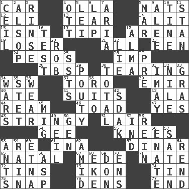 ACROSS 1. Auto 4. Spanish pot 8. Floor protectors 12. Biblical high priest 13. Pull apart 14. Set down 15. Is not 17. Native american tent (variation) 18. Sports stadium 19. Failure 21. Everything 23. Car or cant ending 24. Mexican monetary units 26. Naughty child 28. Cook's measure (abbr.) 30. Pulling apart 34. Compass dir. 37. "Corrida" creature 39. Independent ruler or chieftain 40. Had dinner 41. Sets or collections 43. Wing 44. 480, 500 or 516 sheets of paper 46. Frog relative 47. Affirmative reply 48. Slender, wiry 51. Den 54. Turn to the right 55. Leg joints 58. "We ___ not amused" (Victoria) 61. _ tizzy (2 wds.) 63. Middle Eastern gold or silver currency 65. Relating to or accompanying birth 67. Ancient Persian 71. Nathan's nickname 72. Metal containers 73. Visual representation of an object 74. Shallow baking pan 75. Fastener 76. Habitations of wild animals 77. Conclude DOWN 1. To provide with a ceiling 2. Columnist Joseph or Stewart 3. Wash lightly 4. Baseball player Mel 5. Flowery wreath 6. Pet locale 7. Operatic vocal solo 8. Impair 9. Toward shelter 10. Prong on a fork 11. Comedian Laurel of Laurel & Hardy 16. Trial 18. _ mater 20. Director Reiner 22. Falsehood 25. Fast planes 27. Before (prefix) 29. Marked by pouting 30. "_____ Recall" 31. "If ____ say so..." 32. The longest river in the world 33. Pate de foie ____ 34. Armed conflicts 35. Proofreading order 36. Put on (as clothing) 38. River (Sp.) 42. Neighbor of Neb. 45. Russian fighter aircraft 49. Famous astronaut Armstrong 50. Commissioned mil. rank 52. Indiana (abbr.) 53. It's straight from the horse's mouth 56. Maternal 57. Smooth fabric 58. Pismires 59. Water falling in drops from the sky 60. Inactive volcano in Sicily 62. Among 64. Tear apart 66. Cleo's killer 68. Make supply last 69. Spanish title 70. Followers of ems