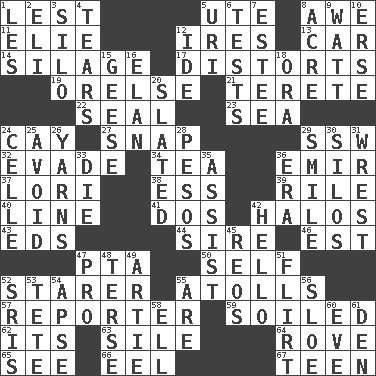ACROSS 1. For fear that 5. Shoshoni 8. Deep reverence 11. Writer Wiesel 12. Angers 13. Auto 14. Fodder prepared in a silo 17. What propaganda does 19. Threatening words 21. Cylindrical with tapered ends 22. Lick closed 23. Ocean 24. Island 27. Fastener 29. Compass dir. 32. Elude 34. Afternoon social gathering 36. Independent ruler or chieftain 37. Australian parrot (variant) 38. Double-curved letter 39. Cause heat under the collar 40. Actor's bit 41. Two (Sp.) 42. Saint headwear 43. Begley and Asner 44. The founder of a family 46. Eastern Standard Time (abbr.) 47. Parent Teacher Association (abbr.) 50. Itself 52. A viewer who gazes fixedly 55. Ringlike coral islands and reefs 57. Newsperson 59. Dirtied 62. It is 63. Drop; flow; fall 64. Be footloose 65. Observe 66. Snakelike fish 67. Adolescent DOWN 1. French article 2. Connecticut Ivy Leaguer 3. Grain storage tower 4. Separates forcefully 5. RI univ. 6. Trials 7. First name in cosmetics 8. Measure of real estate 9. Electrical Unit 10. Celtic language 12. Binary compound 15. Honkers 16. Flair 18. Mouth or opening 20. Scheduled 24. Cell (Danish) 25. Prevent the occurrence of 26. Tall tales 28. Mexican monetary units 29. Grin 30. Grain storage towers 31. Obtain by seizing forcibly or violently 33. Pass on 35. Help 36. Period 42. Phone greeting 45. Vintage cars 47. Adept person 48. Laconic 49. Nick name for Arthur 51. Seductive woman who exploits men 52. Indian titles of respect 53. Wig 54. Domed church section 55. "We ___ not amused" (Victoria) 56. _ gin 58. Pipe bend 60. Night before a holiday 61. Lair