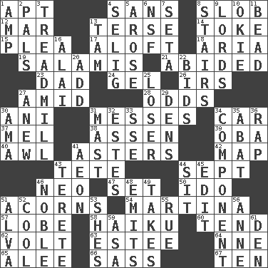 ACROSS 1. Fitting 4. Without 8. Oscar Madison type 12. Spoil 13. Laconic 14. Casino tip 15. Entreaty 17. High up in or into the air 18. Operatic vocal solo 19. Deli grouping 21. Stayed 23. June honoree 24. Set 26. Big collection agency 27. Among 28. Probability 30. Cuckoo 31. Makes clutter 34. 4-wheeled motor vehicle 37. Cartoonist voice _ Blanc 38. NE Netherlands city 39. Chief or king in Benin or Nigeria 40. Leather borer 41. Michaelmas daisies 42. Atlas unit 43. False hair 44. Back-to-school mo. 46. Modern: prefix 47. Put into a specified state 50. Wedding promise 51. Oak nuts 54. Chrissie's court nemesis 57. Ear part 58. Japanese poetic form 60. Watch over 62. Electrical Unit 63. First name in cosmetics 64. Compass dir. 65. Toward shelter 66. Backtalk 67. Nine, plus one DOWN 1. Electrical Unit 2. Friends 3. Excercise machine 4. Former Milwaukee Brewers owner Bud 5. Came up 6. Overdraft (abbr.) 7. Stalk of a moss capsule 8. Flight of steps 9. Titled peers of a realm 10. Migrant worker of the '30s 11. Necklace unit 13. Scottish cap 16. Jai _ 20. Increase 22. Auction offers 25. Failure 27. Afresh 29. Hiding places for outlaws 30. Nursemaid (var.) 31. Vertical spar for supporting sails 32. _____ Park, CO 33. Compass dir. 34. Part 35. Blind as ____ 36. Strike 41. A really long time 43. Cylindrical with tapered ends 44. Be seated 45. Prepare for publication 46. Impressive in appearance 48. Gives off 49. Receives possession of 51. Inventor's middle name 52. Calm and collected 53. "______ My Girl" (Turtles hit) 55. Regret 56. Queen of England 1702-14 59. White ___ sheet 61. Lair
