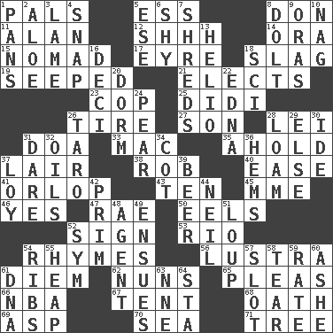 ACROSS 1. Friends 5. Double-curved letter 8. Spanish title 11. Actor Alda or Thicke 12. Quiet! 14. Mouth or opening 15. Roamer 17. Jane of fiction 18. Volcanic refuse 19. Oozed 21. Chooses 23. Police officer (slang) 25. "You Light Up My Life" star Conn 26. Hoop that covers a wheel 27. Boy, to dad 28. Luau accessory 31. ___ good deed 33. Apple computer (short form) 35. Hold, grip (Informal) 37. Den 38. Director Reiner 40. Relaxation 41. Fourth or lowest deck 43. Nine, plus one 45. Madame (abbr.) 46. It is so 47. Actress Charlotte 50. Snakelike fish 52. Public display of a written message 53. River (Sp.) 54. Poems 56. A period of five years 61. South Vietnam president (1954) 62. Religious women 65. Entreaties 66. Basketball assoc. 67. Portable shelter 68. Pledge 69. Viper 70. Ocean 71. Family _ (genealogy) DOWN 1. Zero-star reviews 2. Medicinal plant 3. Unable to walk 4. Fastener 5. Compass dir. 6. Like a shrinking violet 7. Tears up 8. Dunce 9. Mouths or openings 10. Tired old horse 13. Sun: prefix 16. Tenth: prefix 18. _-fi 20. Dormintory (informal) 22. Pulitzer Prize-winning author Ferber 24. Lightbulb-shaped fruit 26. Pacific island yam 28. Rich soil 29. Otherwise 30. Binary compound 31. Have the gumption 32. Petroleums 34. Small bed 36. Folds over and sews together 37. Myrna of the movies 39. Fermented drink made from hops 42. Demure 44. Famous astronaut Armstrong 48. Representative 49. Follows as a consequence or result 51. Central Nebraska county 52. Symbol (abbr.) 54. Chest bones 55. Pile 57. Groove 58. Separate forcefully 59. Pace 60. American tennis player Robert 61. Heredity factor (abbr.) 63. Compass dir. 64. R.R. building