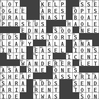 ACROSS 1. Car dealer's back yard 4. Seaweed 8. Compass dir. 11. Double curve, resembling the letter S 13. Ancient Greek god of war 14. Chooses 15. Mountain range 16. Political cartoonist Thomas 17. Water vessel 18. Son of Zeus who helped slay Medusa 21. White Person, in Hawaii 22. Pulitzer Prize-winning author Ferber 23. "Barney Miller" actor Jack 25. Born 26. Begley and Asner 29. What propaganda does 32. Like summer trees 34. Insect wing 35. Santa ___, CA 38. International (abbr.) 39. Artist's stand 41. Charged particles 43. Neckwear 44. Teat (slang) 45. Ancient Celtic tribe of eastern Britain 46. Roamer 50. Allow 51. White ___ sheet 54. Actress Charlotte 55. Singles 57. Archer's quiver 59. Nineveh was its capital 63. "Two Mules for Sister ____" 64. Sums up 67. Post 68. Operatic vocal solo 69. Monthly bill 70. Carry 71. Binary compound 72. It was, poetically 73. Boy, to dad DOWN 1. Central Nebraska county 2. Legendary monster 3. Separate forcefully 4. Sunflower state 5. Period 6. French article 7. Pacific Standard Time (abbr.) 8. Soup utensil 9. Showing deterioration from age 10. First name in cosmetics 12. Otherwise 14. Chief or king in Benin or Nigeria 19. Whirlpool 20. Corn or form start 21. Being at a high temperature 23. Not divided or shared with others 24. Taken by mouth 26. Connecticut Ivy Leaguer 27. Undesirable depression on a surface 28. Suttee (variant) 30. Clothes sense 31. Ketch in the Levant 33. Soared 36. Christmas carol 37. Queen of England 1702-14 39. Inactive volcano in Sicily 40. Helper 42. Be seated 45. Angers 47. Sandy's bark 48. Ridicules or criticizes harshly 49. Followers of ems 51. Slender Brazilian palm 52. Broken piece 53. Nest on high 56. System (abbr.) 58. Auto club (abbr.) 60. Vintage cars 61. To the inside or interior of 62. An important port of Yemen 64. Tate display 65. Morning condensation 66. Heredity factor (abbr.)