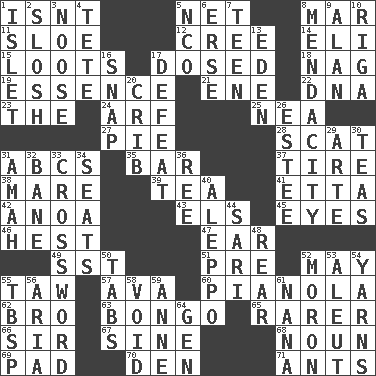 ACROSS 1. Is not 5. Remaining after all deductions 8. Spoil 11. _ gin 12. Algonquian 14. Connecticut Ivy Leaguer 15. Plunders 17. Administered medicine 18. Tired old horse 19. Core 21. Compass dir. 22. Heredity factor (abbr.) 23. Definite Article 24. Sandy's bark 25. Teachers' org. 27. Sliced dessert 28. Get outta here! 31. Lettered men learn these first 35. Long, evenly shaped piece 37. Hoop that covers a wheel 38. Female horse 39. Beverage made from leaves 41. Singer James 42. Small Philippine buffalo 43. Raised railways 45. Sight organs 46. Behest 47. Hearing organ 49. Fast jet (abbr.) 51. Before (prefix) 52. Can I? 55. The 23rd letter of the Hebrew alphabet 57. Actress Gardner 60. Player piano 62. Sis' sibling 63. Beat drum 65. More valued for its uncommonness 66. Title for a knight 67. Trig term 68. Part of speech 69. Groovy apt. 70. Lair 71. Pismires DOWN 1. Small island 2. Splash clumsily 3. Trap for birds or small mammals 4. False hair 5. Non-commissioned officer (abbr.) 6. Celtic language 7. Adolescent 8. Ananias' fault 9. Actor Alda or Thicke 10. Port city in Latvia 13. Genesis locale 16. Fastener 17. Outscore 20. Baby bed with high sides 26. First name in cosmetics 29. Johnson of "Laugh-In" 30. Afternoon social gatherings 31. Housemaid 32. Object of repulsion 33. What you're doing now 34. Theater features 36. To sift 40. City in Syria 44. Indian skirt 48. Bring up, as a child 50. Bar bills 52. Person of subnormal intelligence 53. Native American of Southwest Alaska 54. Tall tales 55. Cook's measure (abbr.) 56. Roberta Peters solo 58. Nothingness 59. Singer Murray 61. Grandmother 64. Commissioned military rank (abbr.)