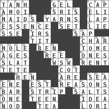 ACROSS 1. Hyperbolic tangent 5. Set 8. Head covering 11. Mine, in Marseilles 12. Indian titles of respect 14. Connecticut Ivy Leaguer 15. Women servants 17. Tall tales 18. Pet locale 19. Core 21. Arrange properly for use 22. Whopper 23. Compass dir. 24. Big collection agency 25. Plant excrement 27. Teat (slang) 28. Burn to charcoal 31. Undercover agent 35. Benjamin's nick name 37. Heavy book 38. Grows older 39. To sift 41. Washington bills 42. Narrow board 43. Compass dir. 45. Monthly bill 46. Wig 47. Small bed 49. Layer 51. "We ___ not amused" (Victoria) 52. Ocean 55. Compass dir. 57. Eastern Standard Time (abbr.) 60. Thinks logically 62. Soap unit 63. Remove all contents or possession from 65. Table seasonings 66. Single 67. Adolescent 68. It may be bright or harebrained 69. Dreamland 70. Afternoon social gathering 71. Australian parrot (variant) DOWN 1. Domesticates 2. Collect or gather 3. Annoying sound 4. Flintstone garb 5. Girls' org. (abbr.) 6. Blunders 7. Actor's bit 8. Portable communications device 9. Jai _ 10. Corncob 13. Fast planes 16. In a ____ (agitated or irritated) 17. Last past 20. Baby bed with high sides 26. Thespian 29. So be it 30. Remainder 31. Vertical spar for supporting sails 32. Stare 33. Resembling or made to resemble leather 34. First name in cosmetics 36. ___ Haven, CT 40. Fortification 44. Had on 48. Afternoon social gatherings 50. Egg locale 52. Twentieth part of a lira 53. Keyboard key 54. Slender Brazilian palm 55. Inky black, to poets 56. Billionth: prefix 58. Proofreading order 59. Relationship diagram 61. Travel by water 64. _ tizzy (2 wds.)