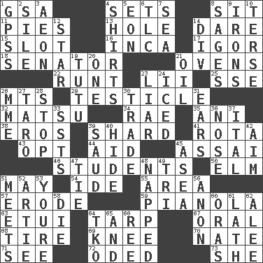 ACROSS 1. Girls' org. (abbr.) 4. Puts into a specified state 8. Be seated 11. Sliced desserts 13. Opening into or through something 14. Have the gumption 15. Narrow opening 16. South American Indian 17. Russian composer Stravinsky 18. Elected representative 21. Baking chambers 22. Undersized animal 23. Cards in a Roman deck? 25. Compass dir. 26. Mountains (abbr.) 29. A testis 32. Taiwanese island in East China Sea 34. Actress Charlotte 35. Black tropical American cuckoo 38. Greek god of love 39. Broken piece 41. Roll call or roster of names 43. Elect 44. Assist 45. Slender Brazilian palm 46. SAT takers 50. Shade tree 51. Fifth month 54. Binary compound 55. Length times width 57. Wear away 59. Player piano 63. Needle holder 64. Canvas cover 67. Spoken 68. Become fatigued 69. Leg joint 70. Nathan's nickname 71. Observe 72. Wrote a lyric poem 73. A female animal or person DOWN 1. Global Positioning Systems (abbr.) 2. Drop; flow; fall 3. Period of immesurable duration 4. Upper-body garments 5. A really long time 6. Affectionate concern, for short 7. Ocean 8. Gurus 9. Metal shackles 10. Laconic 12. Play the lead 14. HTML Container Element 19. Ballerina skirt 20. Single 21. Lubricate 23. One who doesn't tell the truth 24. On the rocks 26. Madame (abbr.) 27. Pacific island yam 28. Constrict 30. Swap 31. Hearing organs 33. Fast planes 36. Characteristic smell of wine 37. Slanted text style (abbr.) 39. Saudi Arabian king (1953-1964) 40. Flintstone garb 42. Direct toward a target or goal 45. At sea 47. Standoff 48. Slept 49. Three (prefix) 51. Confronts 52. Nick name for Arthur 53. You are 56. At once, immediately (arch.) 58. Expire 60. Mouths or openings 61. Thin strip of wood or metal 62. Toward shelter 64. Ring climax 65. Also 66. To riddle
