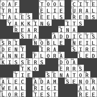 ACROSS 1. Clumsy lout 4. Implement 8. Quote 12. Three (prefix) 13. Writer Wiesel 14. Mountain range 15. Stories 18. Snakelike fish 19. Confederate soldiers (slang) 20. Chattering 22. It is 23. Tail end 24. _ tizzy (2 wds.) 25. R.R. building 26. Inveterate users 30. _ Lanka 33. Impressive in appearance 36. Famous astronaut Armstrong 37. Gouge 39. Lyricist Gershwin 40. Beget 41. Queen of England 1702-14 42. Plants 44. Directed 45. Smoochers 47. ___ good deed 50. Ring climax 51. Blunders 53. Standoff 54. Elected representative 57. Actor Baldwin 59. First of billions? 61. Sir (Sp.) 63. Welt 64. Swiss mountan, "Queen of the Mountains" 65. Wing 66. Old wives' tales, e.g. 67. Trial 68. Portuguese money of account (variant) DOWN 1. Baseball player Mel 2. Like ___ of sunshine 3. Having threads 4. Adolescent 5. Cassini of fashion 6. Petroleum 7. French article 8. Window treatments 9. Angers 10. Keyboard key 11. Raised railways 16. Makes supply last 17. Three-handed card game 21. SW Asia republic 22. Working for oneself (abbr.) 24. Binary compound 26. Having or resembling wings 27. To provide with a ceiling 28. Hoop that covers a wheel 29. Downhill vehicle 30. Neighbor of Neb. 31. Painter Guido (1575-1642) 32. Restaurants 34. Lubricates 35. Sis' sibling 38. A testis 42. From 43. Arabian gulf 46. Make supply last 48. Mouths or openings 49. Johnson of "Laugh-In" 52. Echolocation 53. Separate forcefully 54. Droops 55. Give off 56. Hero or heavy, e.g. 57. Leather borer 58. Lion 59. Nonscientific branch of learning 60. Expire 62. Actress Charlotte