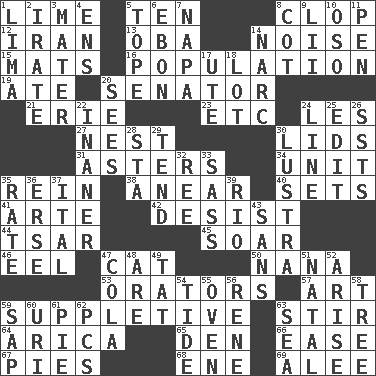 ACROSS 1. Citrus frut 5. "___ Little Indians" 8. Hoof sound 12. SW Asia republic 13. Chief or king in Benin or Nigeria 14. Annoying sound 15. Floor coverings 16. Census information 19. Had dinner 20. Elected representative 21. 4th largest of the Great Lakes 23. And so on (abbr.) 24. French article 27. A home for chicks 30. Flaplike coverings 31. Michaelmas daisies 34. A single undivided whole 35. It's straight from the horse's mouth 38. Approach 40. Puts into a specified state 41. Johnson of "Laugh-In" 42. Stop 44. Russian ruler of old 45. Fly high 46. Snakelike fish 47. Feline 50. Grandmother 53. Speakers 57. Tate display 59. Supplying deficiencies 63. Use a spoon 64. N. Chile seaport 65. Lair 66. Relaxation 67. Sliced desserts 68. Compass dir. 69. Toward shelter DOWN 1. Pale green bean 2. Feeling or showing extreme anger 3. Mother 4. Followers of ems 5. Drink excessively 6. Inky black, to poets 7. California wine valley 8. Small bed 9. Cards in a Roman deck? 10. Bear (Spanish) 11. Fenced enclosure 14. Drug cop 17. Shoshoni 18. Car dealer's back yard 20. Perceives with the eye 22. Sillier 24. Actor's bit 25. Prepare for publication 26. Fast planes 28. R.R. building 29. Look after 30. A period of five years 32. Portuguese money of account (variant) 33. Backtalk 35. Pace 36. Celtic language 37. Slanted text style (abbr.) 39. River (Sp.) 43. Without 47. Root beer relative 48. "We ___ not amused" (Victoria) 49. Make lace 51. Relating to or accompanying birth 52. Originate 54. Periodic rise and fall of the sea level 55. Baking chamber 56. French philosopher Descartes 58. Relationship diagram 59. Plant excrement 60. RI univ. 61. Sliced dessert 62. Personal Computers (abbr.) 63. Ocean