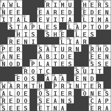 ACROSS 1. Leather borer 4. Tall New Zealand timber tree 8. Possessive pronoun 12. Born 13. Having ears or earlike features 14. Genesis locale 15. Slanted text style (abbr.) 17. Webber/Rice musical 18. Pale green bean 19. Paper fasteners 21. Portable computer 23. Part of HMS, perhaps 24. A female animal or person 26. French article 27. Painter Guido (1575-1642) 28. One who doesn't tell the truth 30. For each 31. Titan orbits this 34. 17th letter of the Greek alphabet 37. A saturated hydrocarbon 38. Stay 39. Car or cant ending 40. Dreamland 41. Food holders 42. Compass dir. 43. College mil. group 44. Set of matching outer garments 46. Greek goddess of the dawn 47. Auto club (abbr.) 50. Conclude 51. Heat 54. Hard copy producer 57. Medicinal plant 58. Flexible twig of a willow tree 60. Washington bills 62. Redecorate 63. Seines 64. Head covering 65. Observes 66. Inactive volcano in Sicily 67. Epoch DOWN 1. Black tropical American cuckoo 2. Moistens 3. Resembling or made to resemble leather 4. All-night dance parties 5. From or relating to Ireland 6. Was introduced to 7. Freehold land 8. Aide 9. Proofreads 10. San ____ (Riviera town) 11. Fastener 13. Snakelike fish 16. (Had) reclined 20. Air pressure measure (abbr.) 22. Actor Alda or Thicke 25. Evade 27. Western Nevada city 29. Angers 30. Baking dish 31. Table seasoning 32. Phillipine bananalike plant 33. Teat (slang) 34. Dwelling 35. Behest 36. Single 41. Mail 43. Lover boys 44. Elected rep. 45. To (old English) 46. Wear away 48. Bee-related 49. Sports stadium 51. Armed conflicts 52. Toward shelter 53. Flexible conduit 55. Big collection agency 56. Bring up, as a child 59. Put into a specified state 61. Health resort