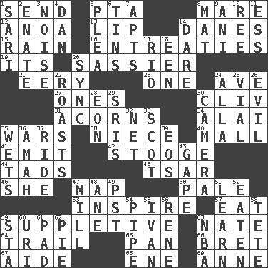 ACROSS 1. Post 5. Parent Teacher Association (abbr.) 8. Female horse 12. Small Philippine buffalo 13. Mouth edge 14. Natives or inhabitants of Denmark 15. Precipitation 16. Pleas 19. ___ a Wonderful Life 20. More lively and spirited 21. Suggestive of the supernatural 23. Single 24. "___ Maria" 27. Singles 30. 154 in Roman numerals 31. Oak nuts 34. Mountain range southwest of Kyrgyzstan 35. Armed conflicts 38. Sibling's daughter 40. Promenade 41. Send forth 42. Moe Howard, for one 44. Small boys 45. Russian ruler of old 46. A female animal or person 47. Atlas unit 50. Diluted with white 53. Heighten or intensify 57. Erode 59. Supplementary 63. Nathan's nickname 64. Get behind 65. Baking dish 66. Cy Young winner Saberhagen 67. Helper 68. Compass dir. 69. Singer Murray DOWN 1. Indian skirt 2. Related on the mother's side 3. Annoying sound 4. One of the 12 tribes of Israel 5. Entreaty 6. Canisters 7. Flats, for short 8. Floor covering 9. Black tropical American cuckoo 10. To riddle 11. Curvy letter 14. Have the gumption 17. River (Sp.) 18. Car or cant ending 20. Synchronize (abbr.) 22. Exposes to great heat 24. Silent film actress Nazimova 25. Small bottle 26. Morally bad or wrong 28. Period of immesurable duration 29. Indian titles of respect 30. Device for capturing images 32. Fish or hair follower 33. Native of Scotland 35. Soaks 36. Nursemaid 37. Travel on an animal 39. Greek goddess of the dawn 43. Yawn 47. Place where flour is made 48. A saturated hydrocarbon 49. Pacific Standard Time (abbr.) 51. Acquire or gain knowledge or skills 52. Ingested 54. Corncob 55. "Terrible" tsar 56. French philosopher Descartes 58. False hair 59. R.R. building 60. RI univ. 61. Writing tablet 62. Sliced dessert 63. Basketball assoc.